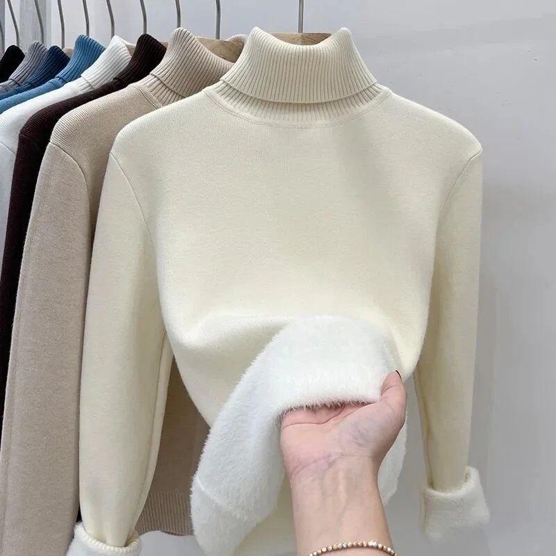 肥厚フリースハイカラーセーター女性の長袖インナーウェア秋冬新スタイル暖かいベースレイヤーファッショナブルなトップ