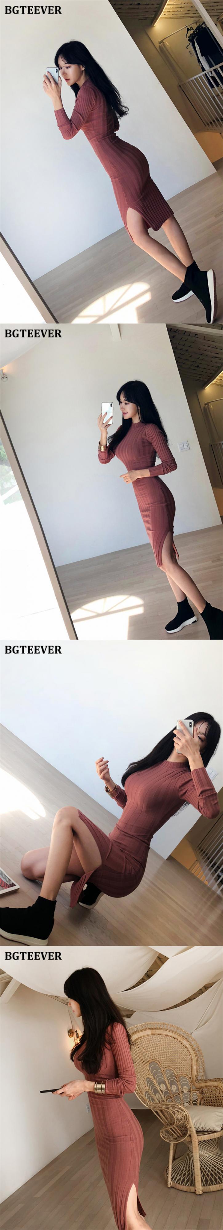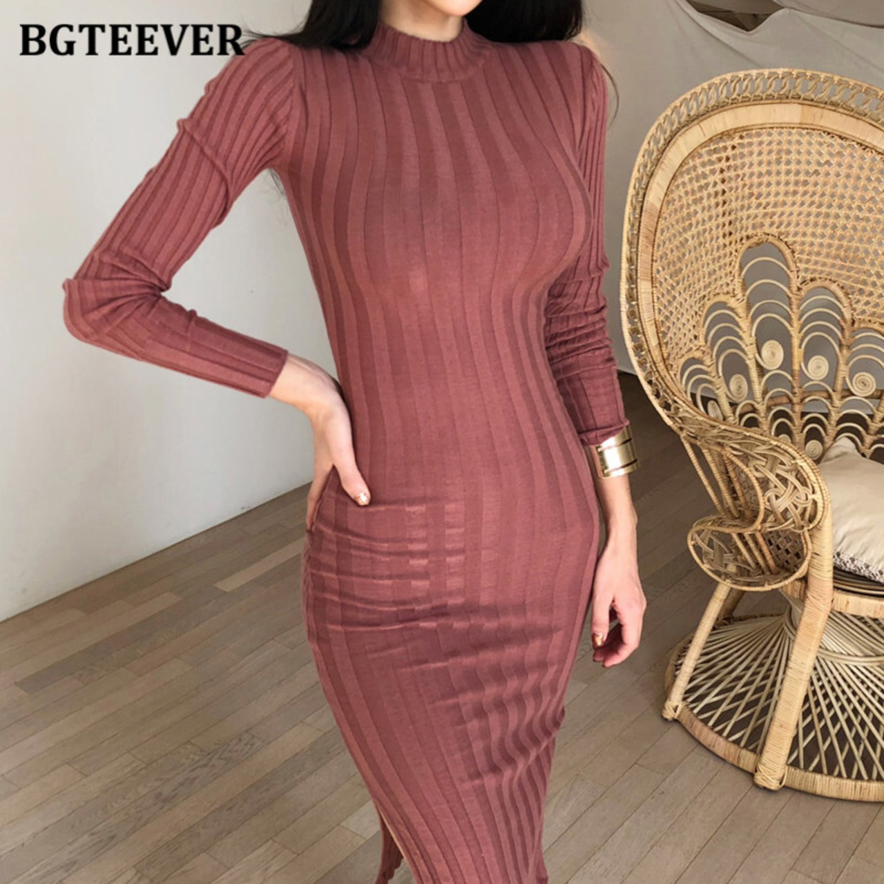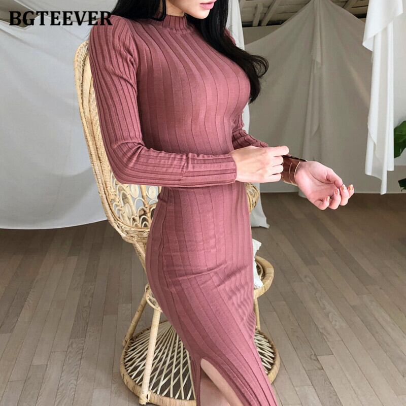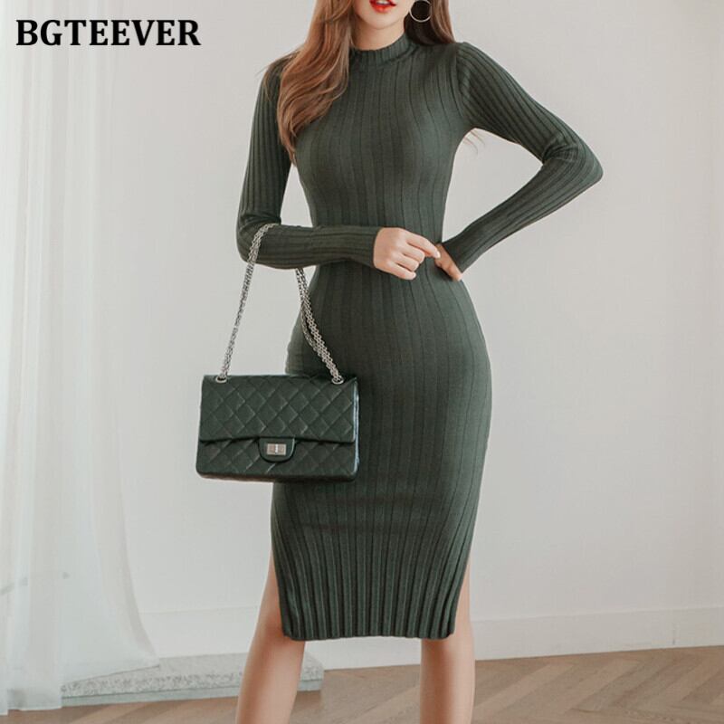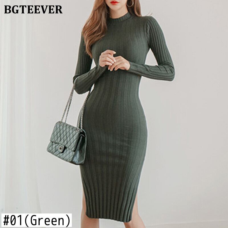 【新作】【送料無料】 BGTEEVERハーフタートルネックレディースニットミディドレススリムウエストサイドスプリットスキニーセータードレス2020秋のVestidos オータム 秋物 12b136272347368