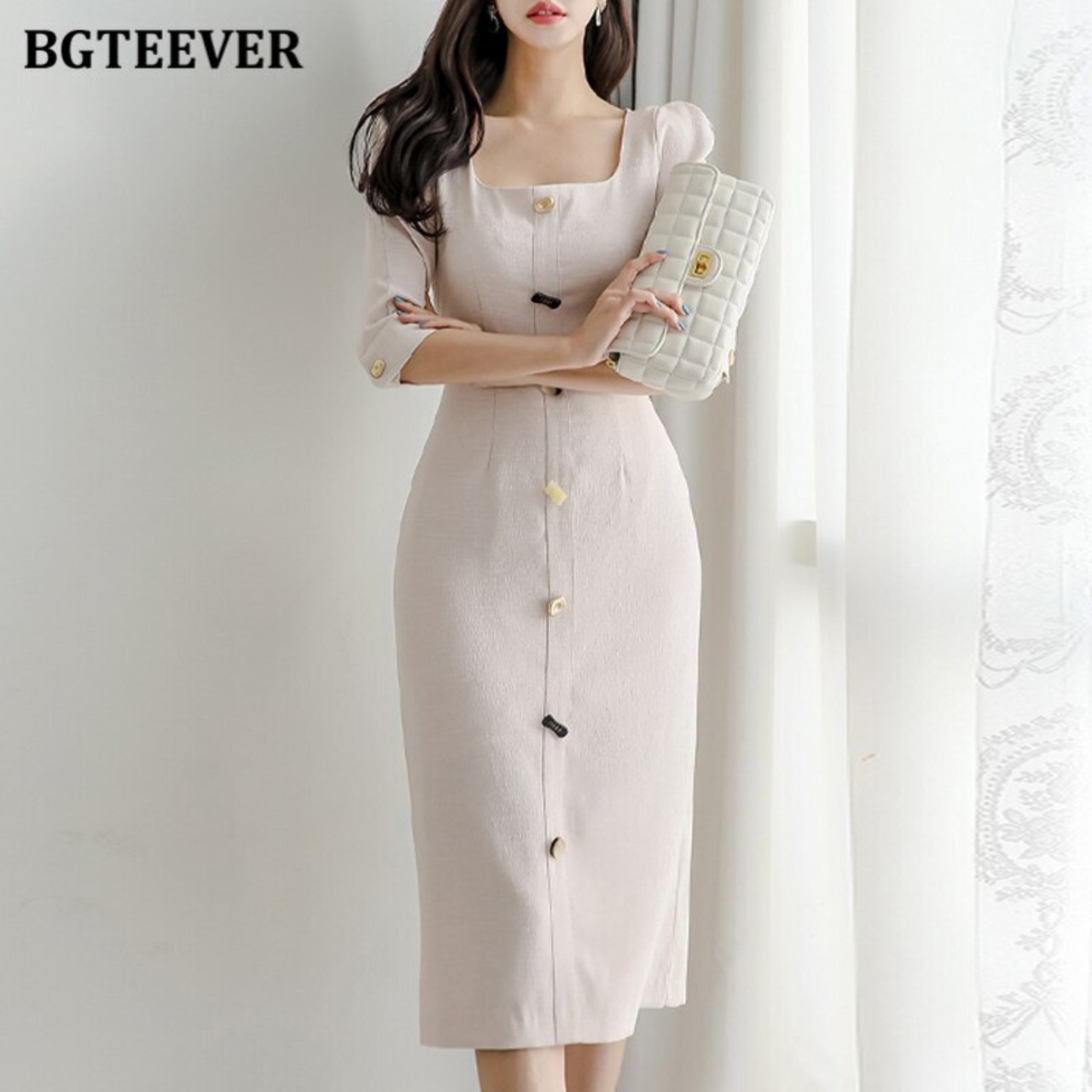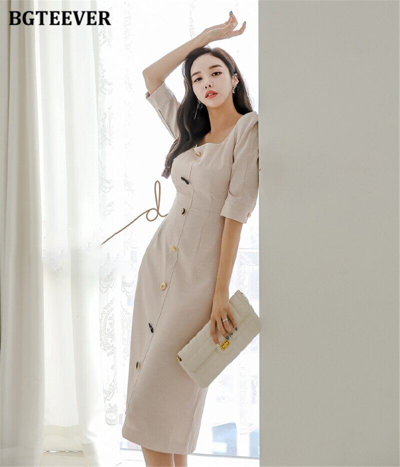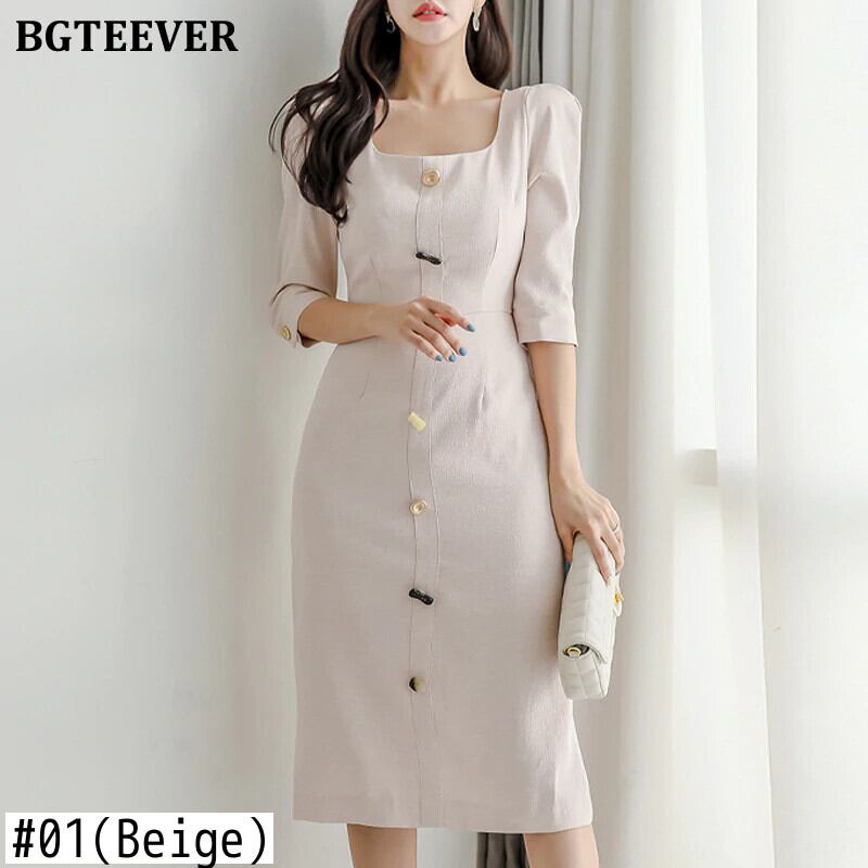 【新作】【送料無料】 BGTEEVERオータムスクエアカラーレディースパッケージヒップドレスハーフスリーブシングルブレストスリムOLVestidos Office Wear 2020 半袖 秋物 スクウェア 会社 学校 通勤や通学にも 12b170777341753