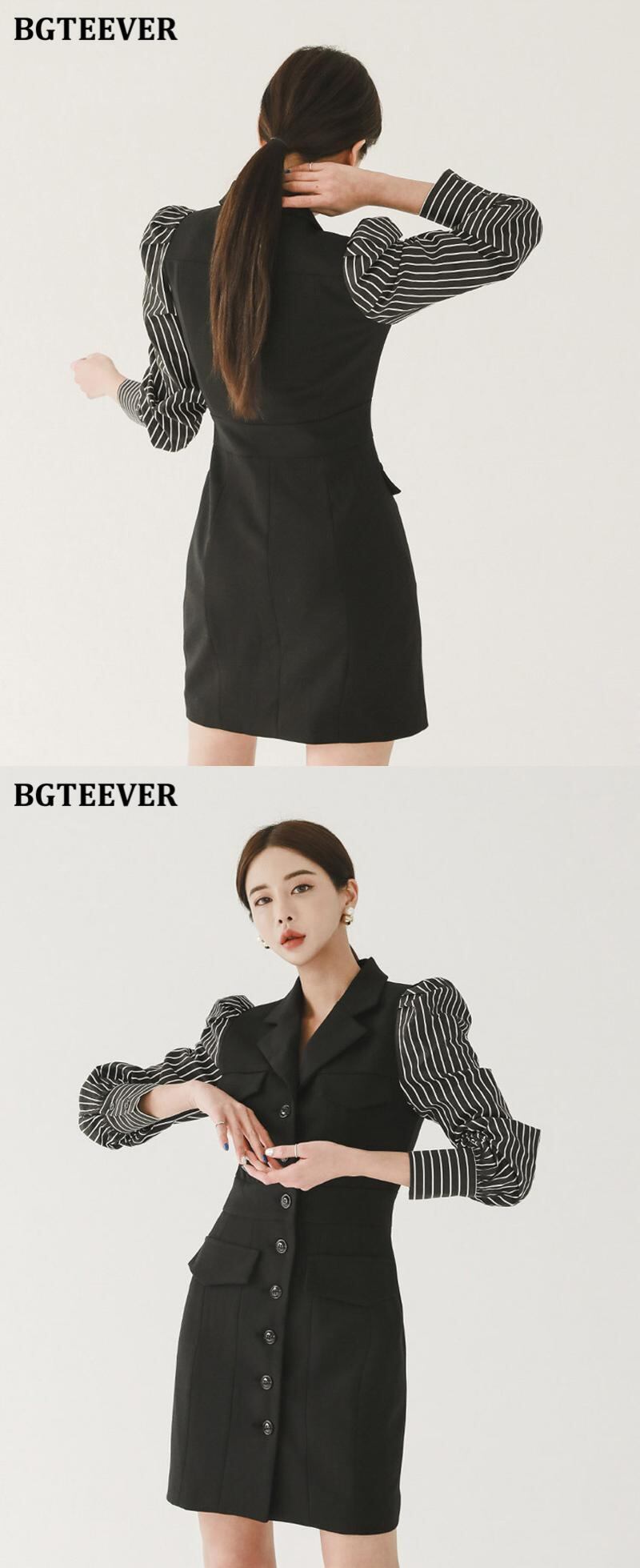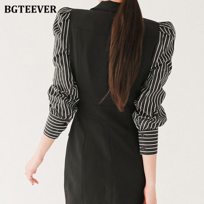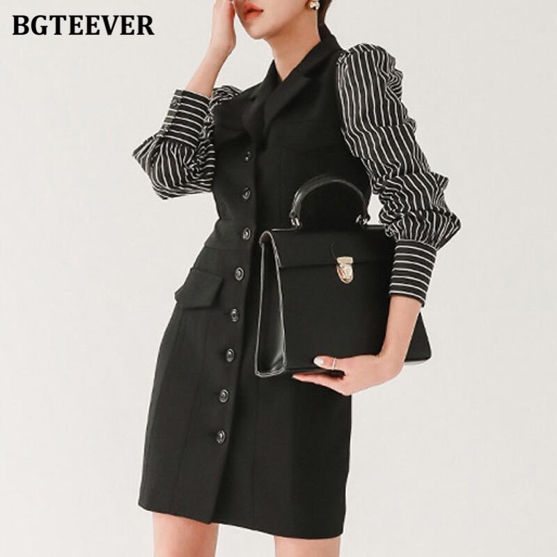 【新作】【送料無料】 BGTEEVERスタイリッシュなパッチワークストライプの女性ミニドレスシングルブレストフルスリーブスリムボディコンドレス 12b131988685437