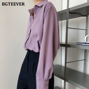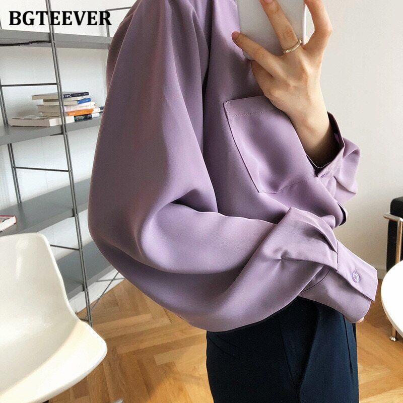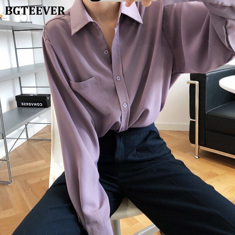 【新作】【送料無料】 BGTEEVERヴィンテージパープルシャツブラウス女性秋ターンダウンカラーシングルブレスト長袖シャツトップス2020 ロング オータム 秋物 ビンテージ 12b15394494268