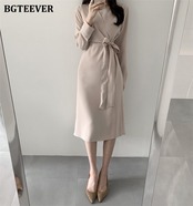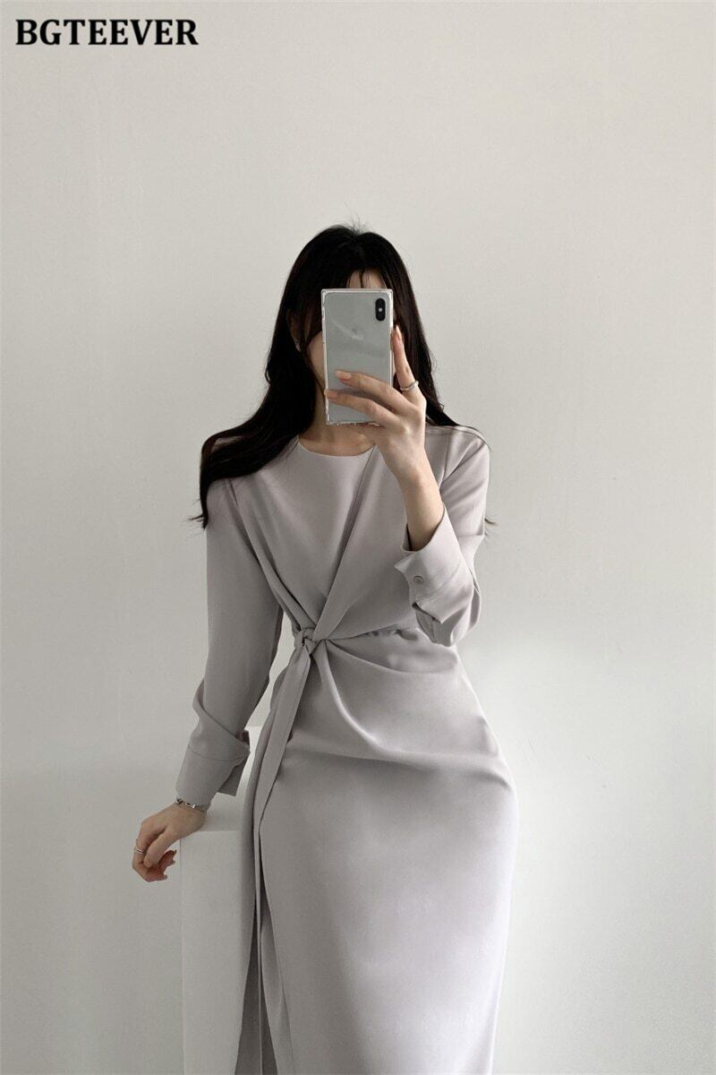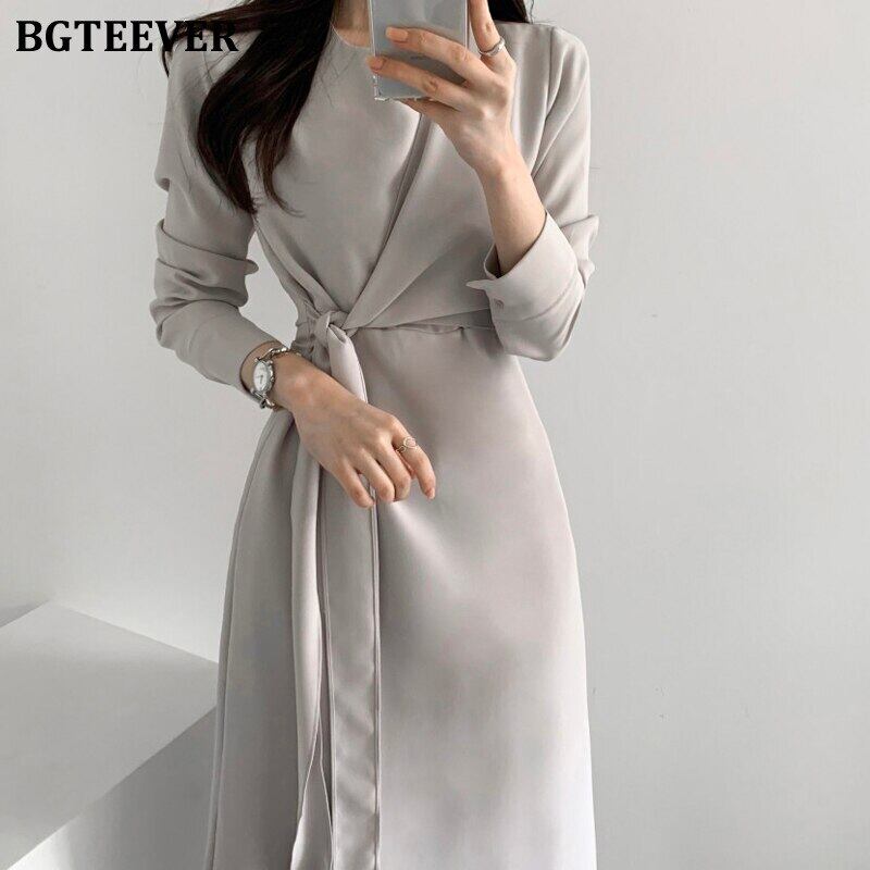【新作】【送料無料】 BGTEEVERオフィスレースアップミドル丈ドレスOネックフルスリーブスリムウエストレディースAラインドレス2020秋のVestidos オータム 秋物 会社 学校 通勤や通学にも 12b187924427727