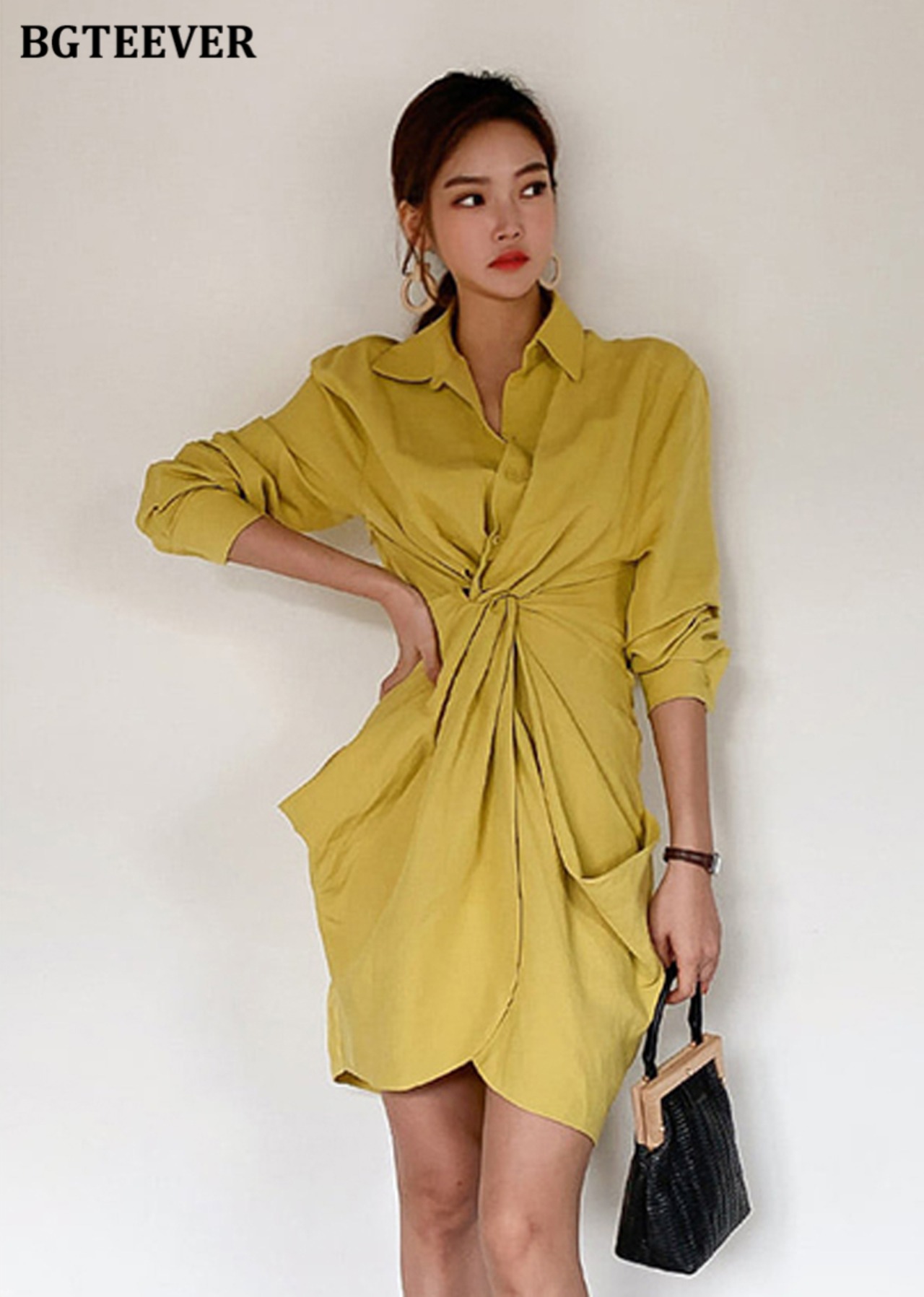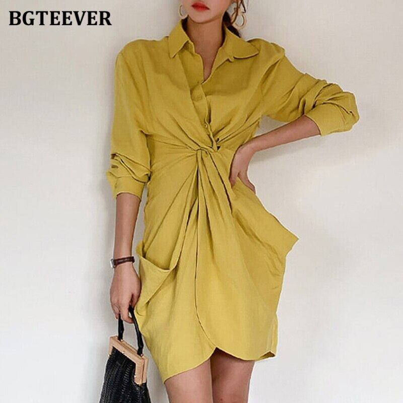 【新作】【送料無料】 BGTEEVERシングルブレストノットドレススタイリッシュなターンダウンカラー長袖スリムウエストミディドレス女性2020 ロング 12b167651075703