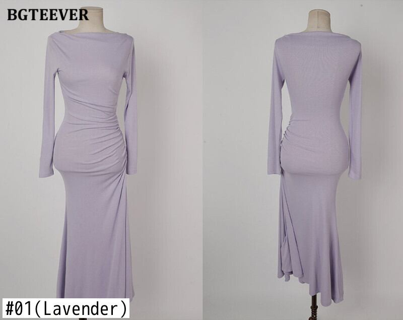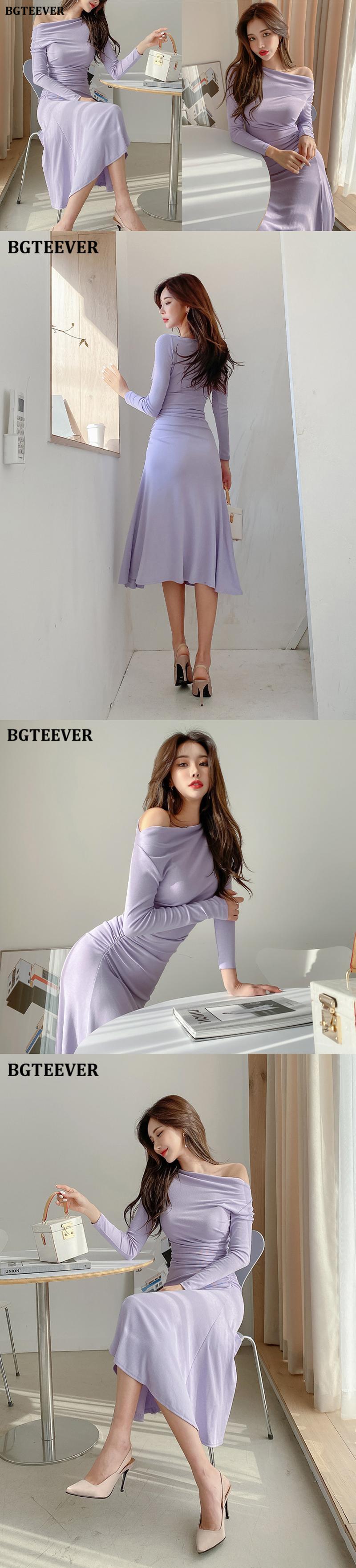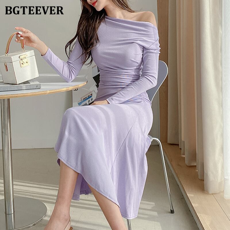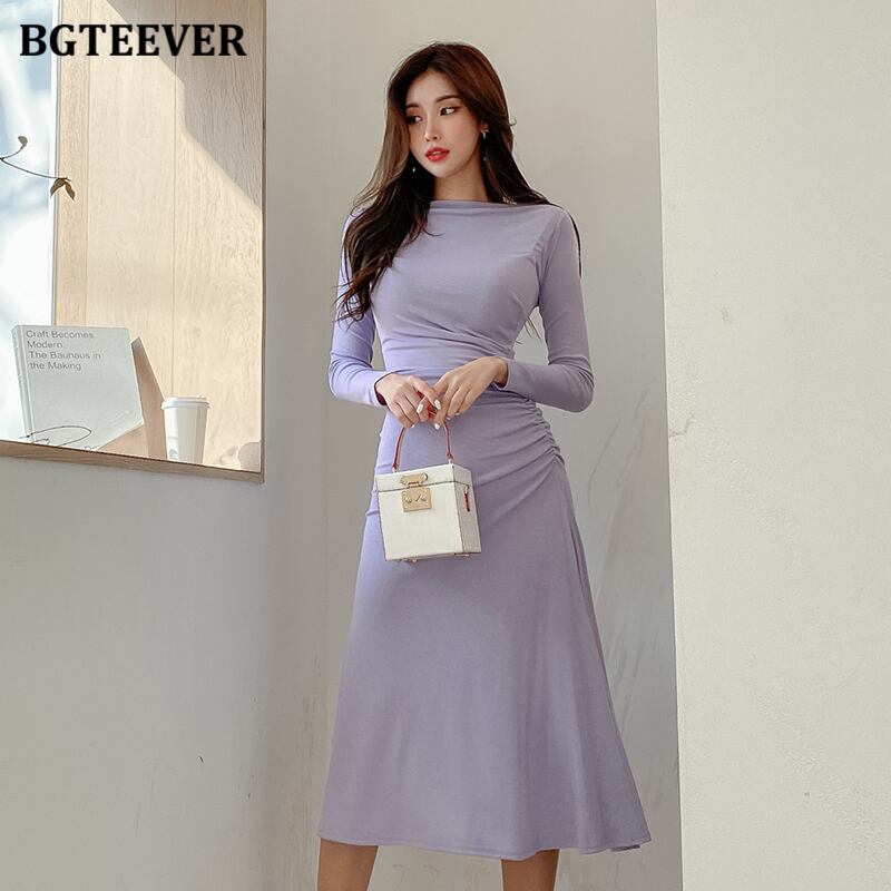 【新作】【送料無料】 BGTEEVERスラッシュネックミドル丈ドレス2020秋のシャーリングスリムウエストAラインドレス女性Vestidos オータム 秋物 12b124936358148