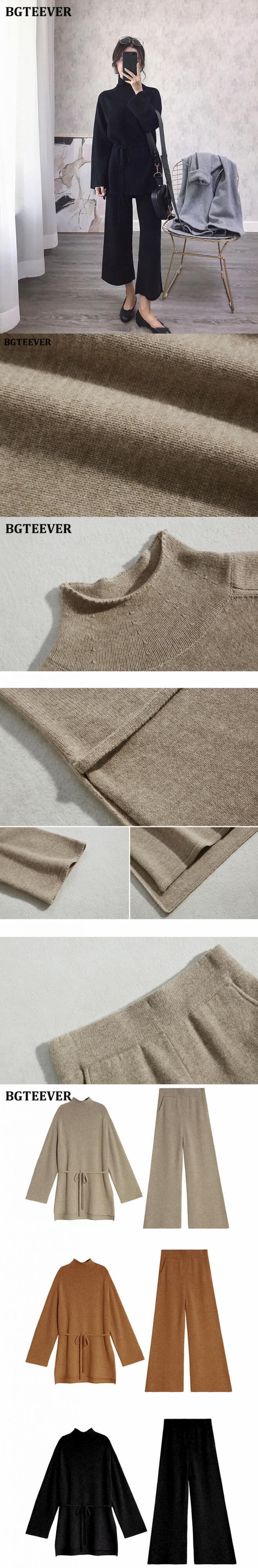 【新作】【送料無料】 ウィンターニット2ピースセット女性タートルネックレースアッププルオーバー&伸縮性ウエストルーズパンツ女性セータートラックスーツ エラスティック 冬物 12b150186442512