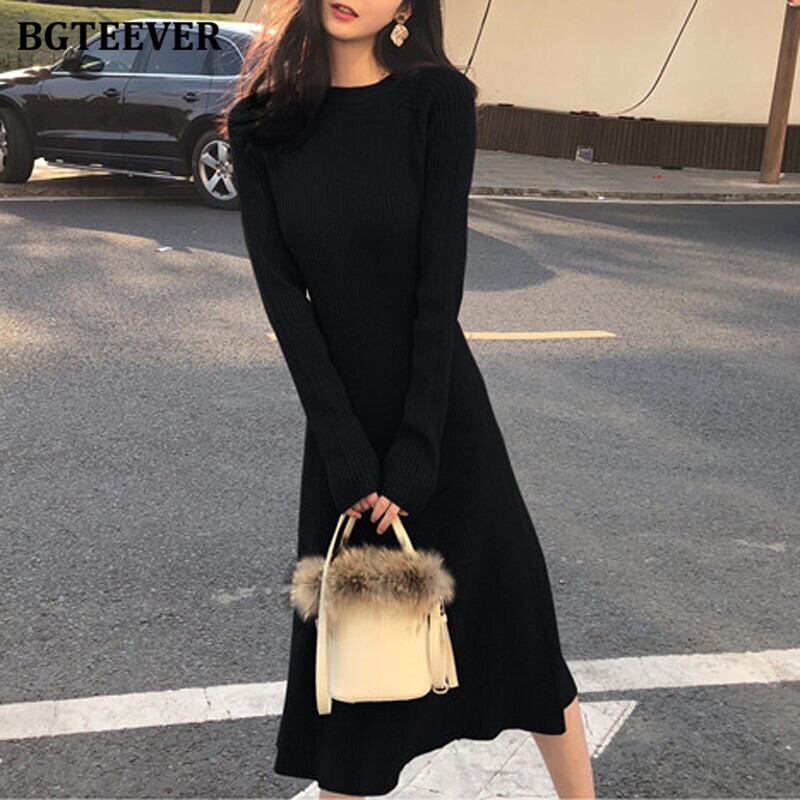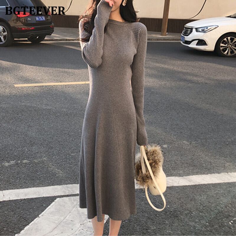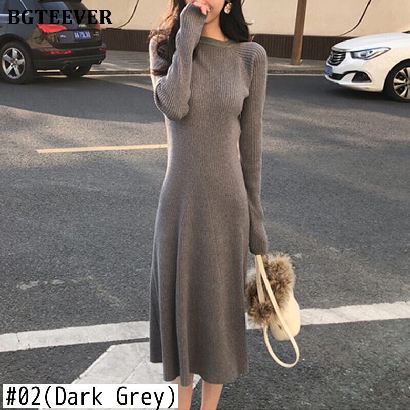 【新作】【送料無料】 BGTEEVER秋の厚手のOネックプルオーバーセータードレス2020長袖スリムウエストミッドカーフニットドレスVestidos ロング オータム 秋物 12b160104648958
