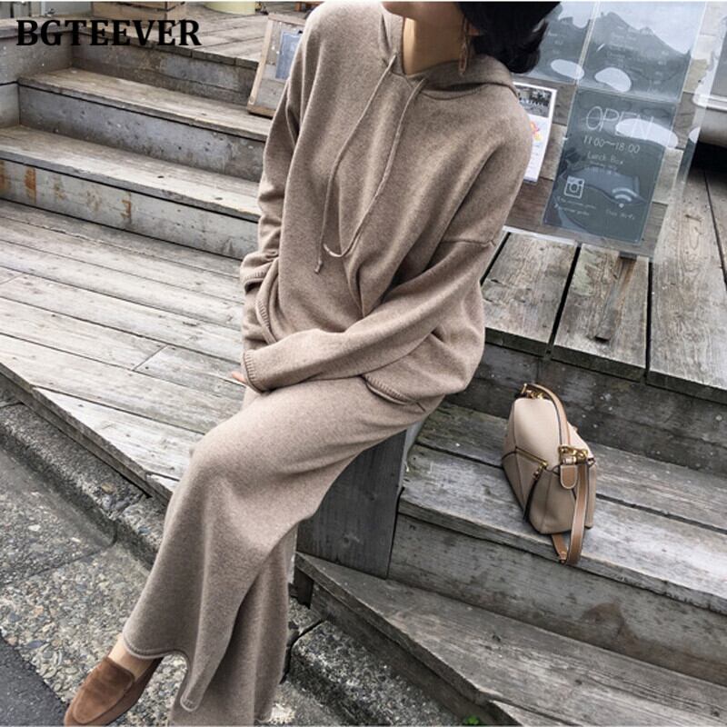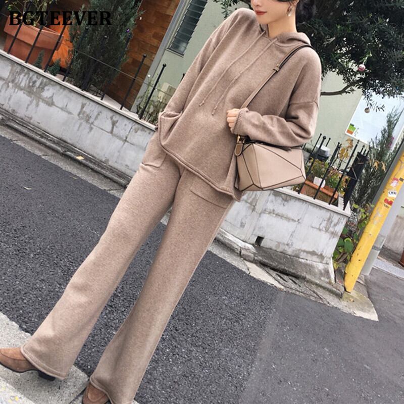 【新作】【送料無料】 BGTEEVERニット2点セット女性用フード付きプルオーバー&伸縮性ウエストワイドレッグパンツ2020秋冬セーターセット エラスティック オータム 秋物 ウィンター 冬物 ワイドパンツ 12b141467169866