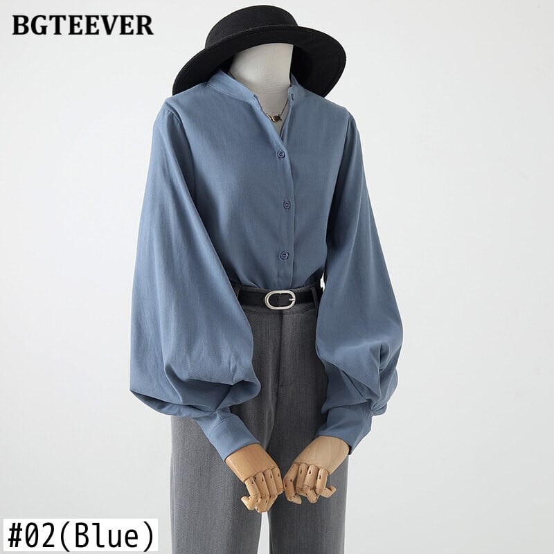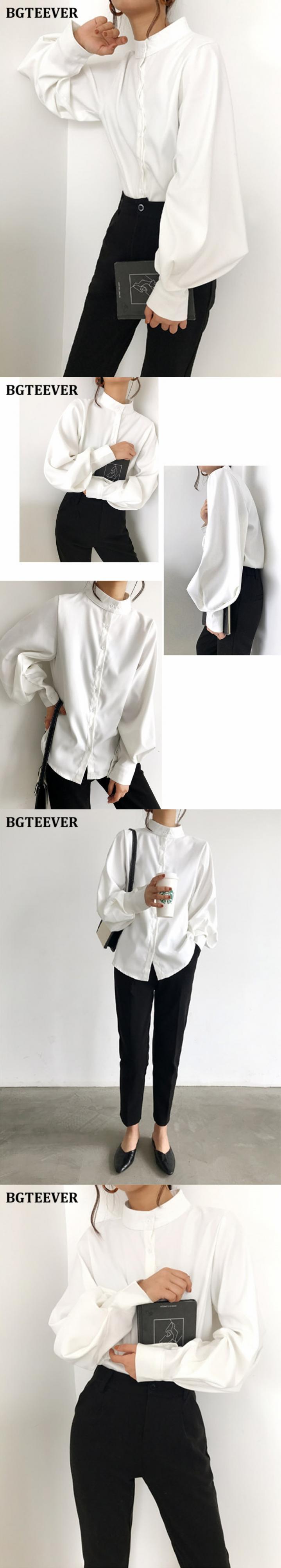 【新作】【送料無料】 BGTEEVERヴィンテージスタンドカラーランタンスリーブホワイトシャツブラウス女性秋冬厚手のブラウス2020 オータム 秋物 ウィンター 冬物 ビンテージ 12b145300351614