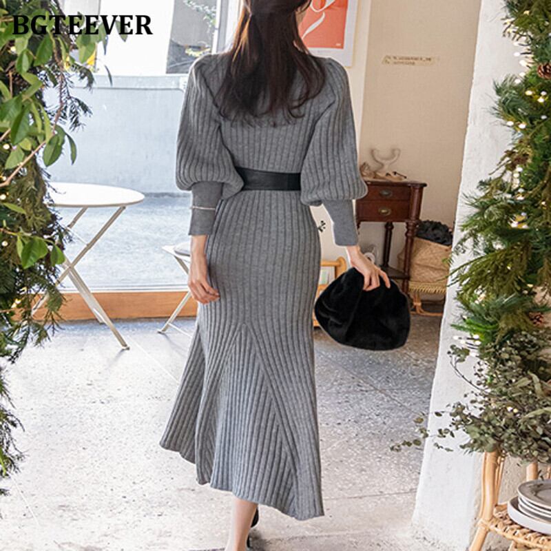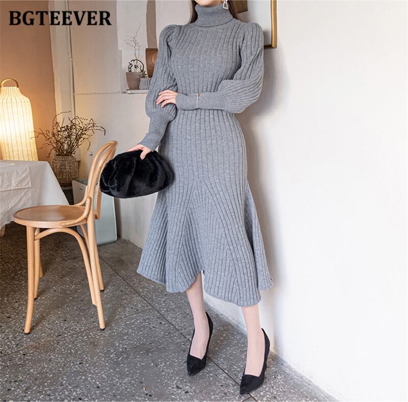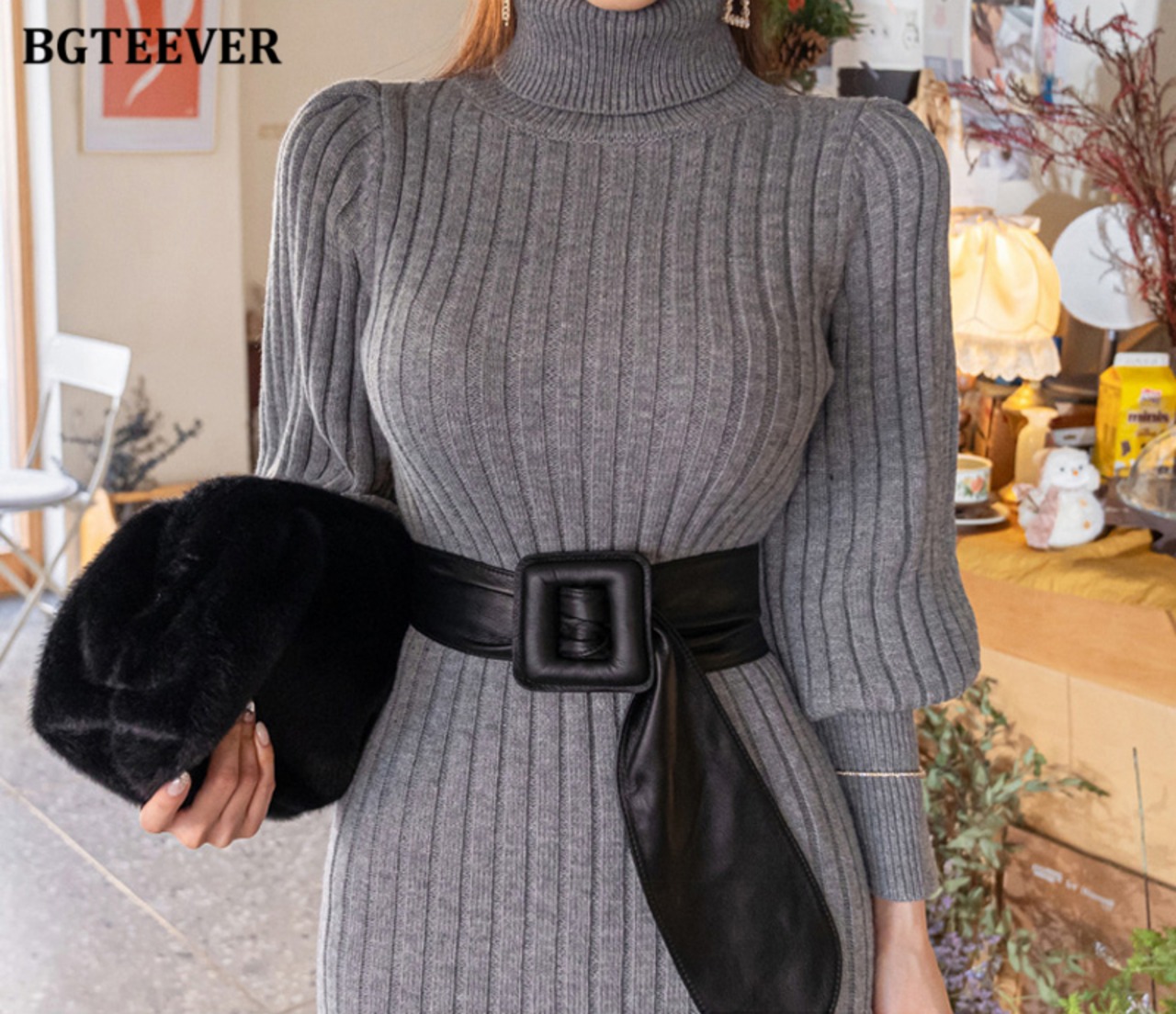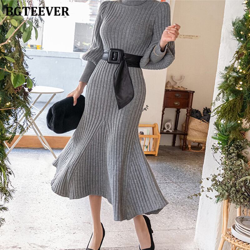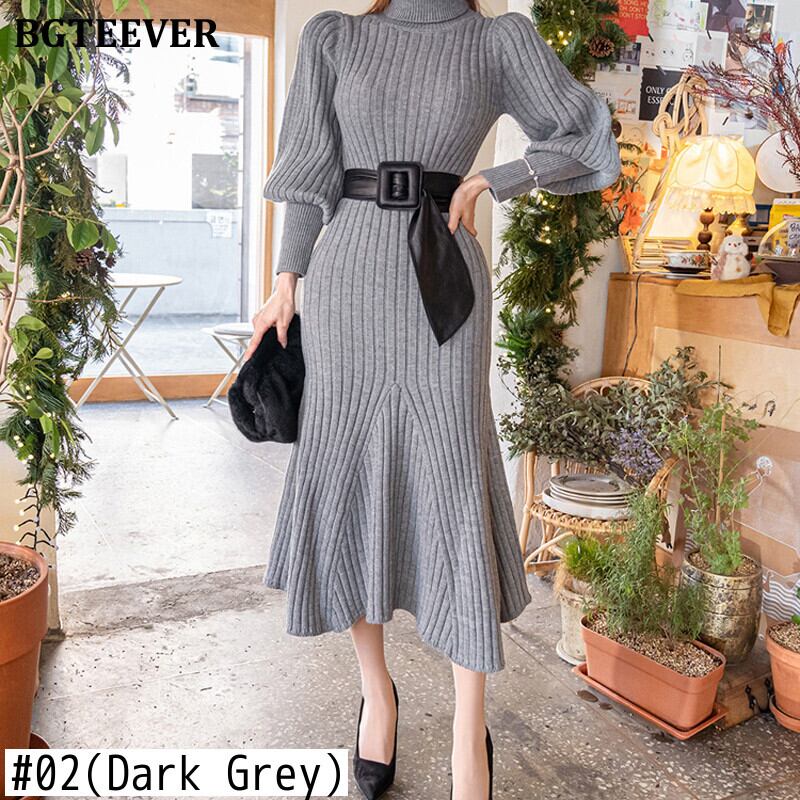 【新作】【送料無料】 BGTEEVER WinterThickenウォームタートルネックセータードレスレディースランタンスリーブベルト付きマーメイドニットドレス2020 ウィンター 冬物 ハーネス 12b193452198363