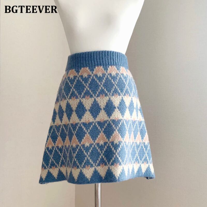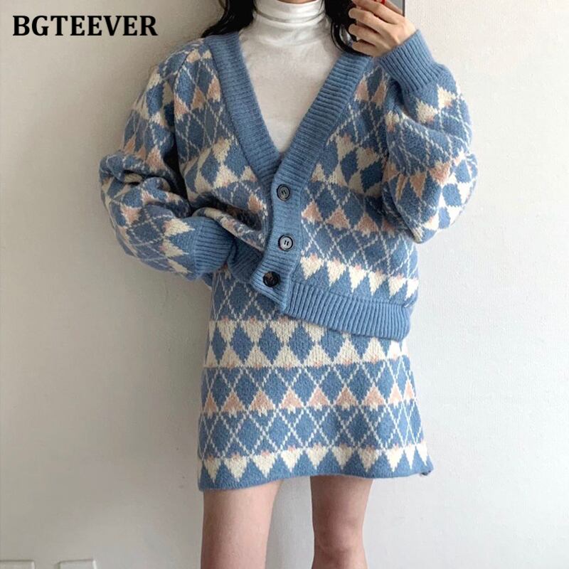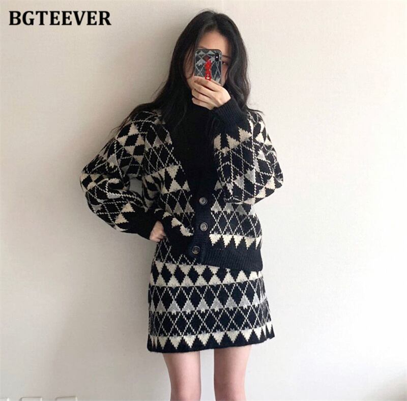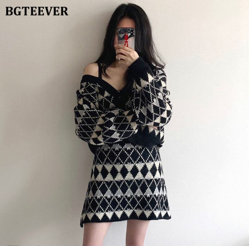 【新作】【送料無料】 BGTEEVER秋冬ニット2点セットレディースVネックアーガイルカーディガン&エラスティックウエストショートスカート2020セーターセット 伸縮 オータム 秋物 ウィンター 冬物 12b190152235644