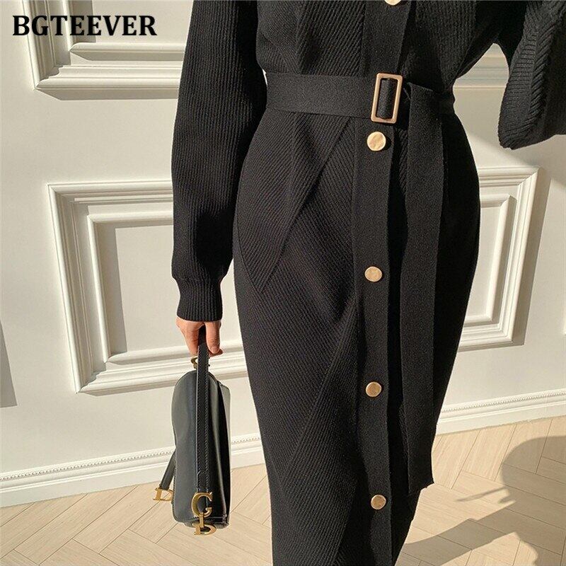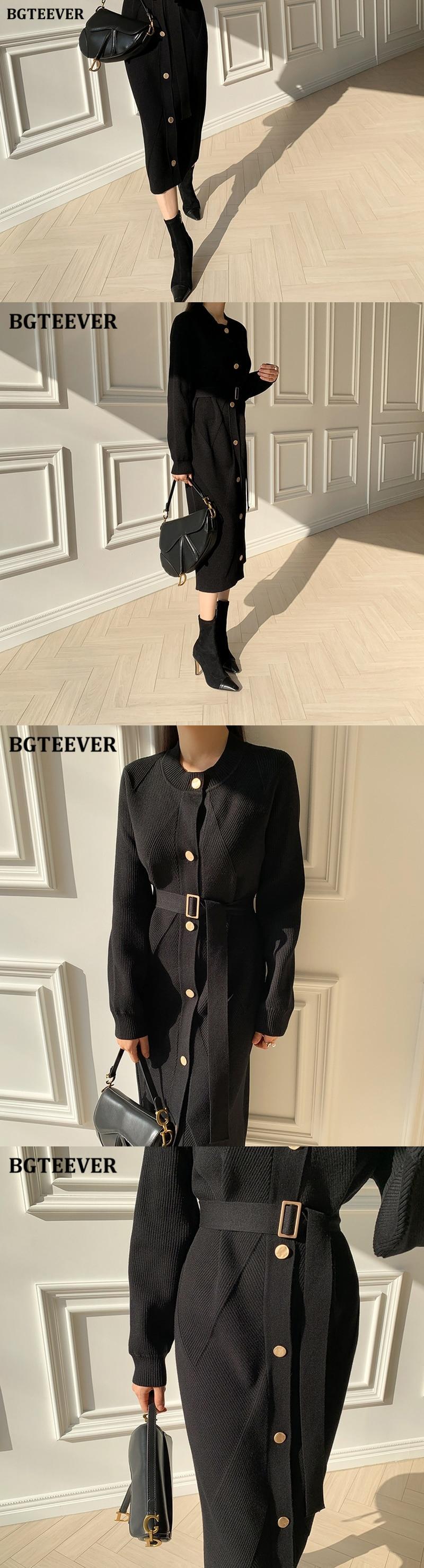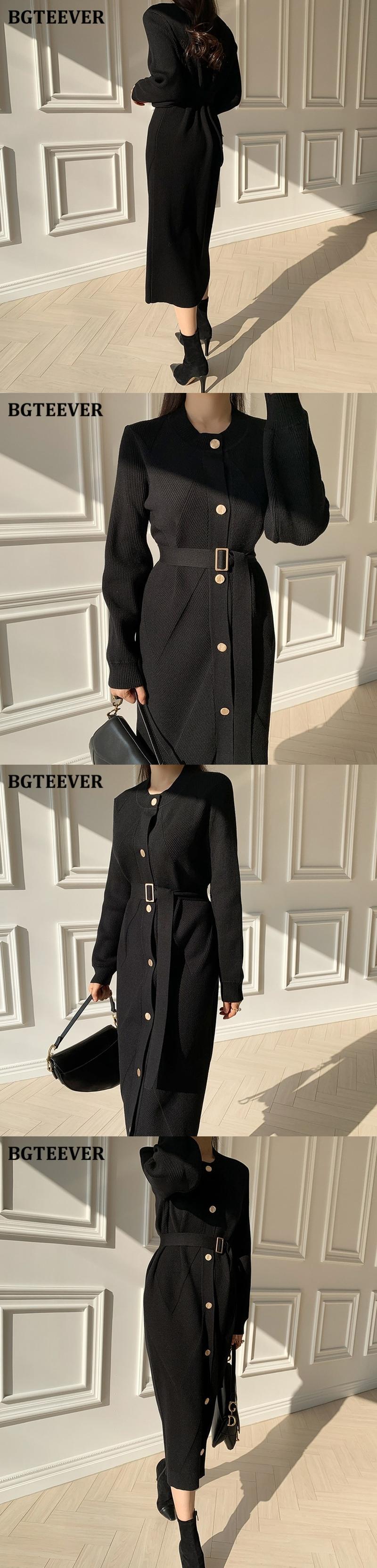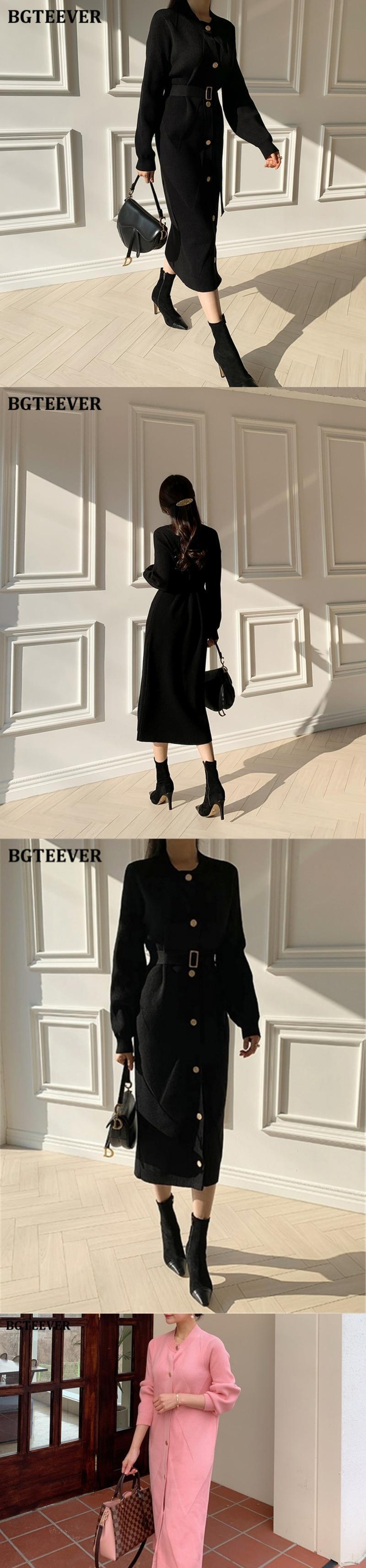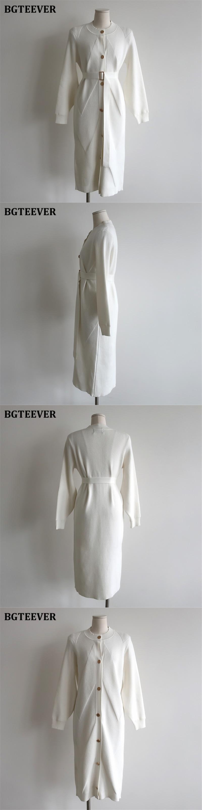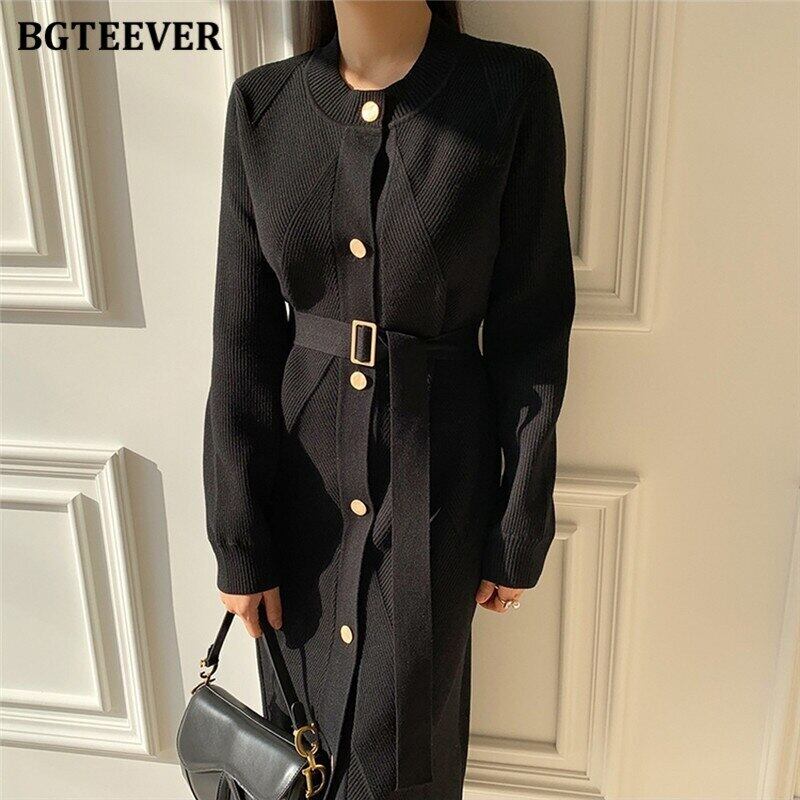 【新作】【送料無料】 BGTEEVER秋冬Oネックシングルブレストベルト付きレディースニットミディドレスルーズセーター オータム 秋物 ウィンター 冬物 ハーネス 12b136287229758