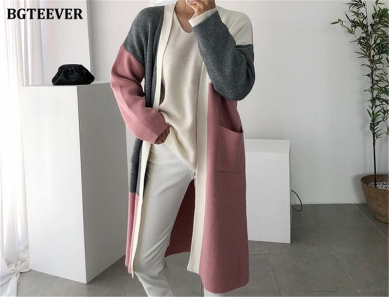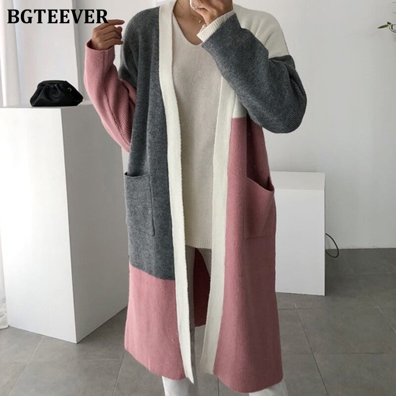 【新作】【送料無料】 BGTEEVERスタイリッシュなパッチワーク女性ロングニットカーディガンVネック長袖ルーズウォームニットセーター2020冬 ウィンター 冬物 12b148340234407