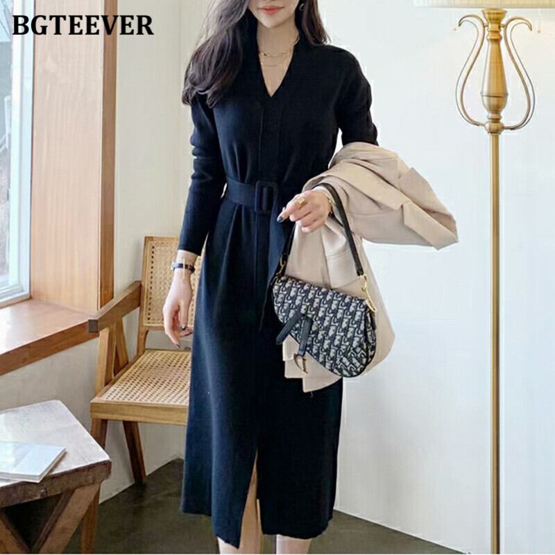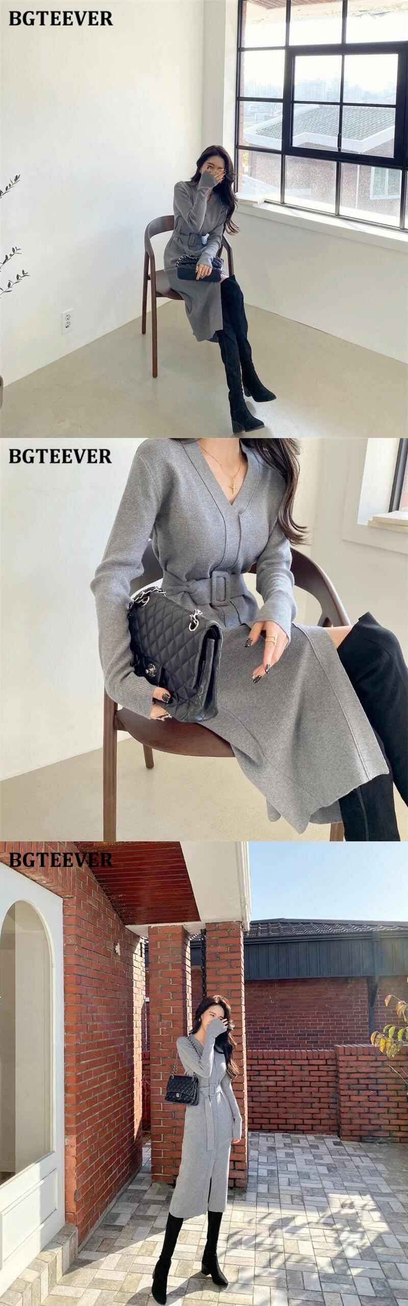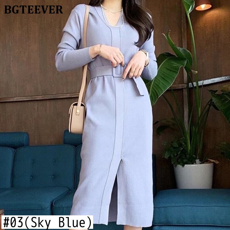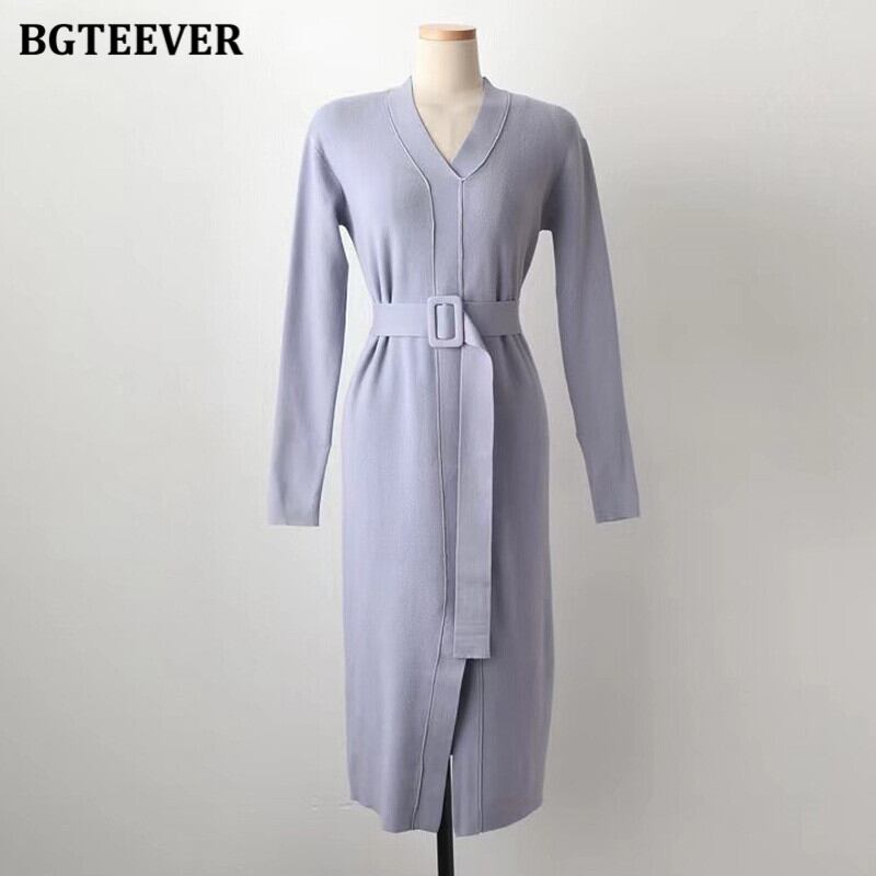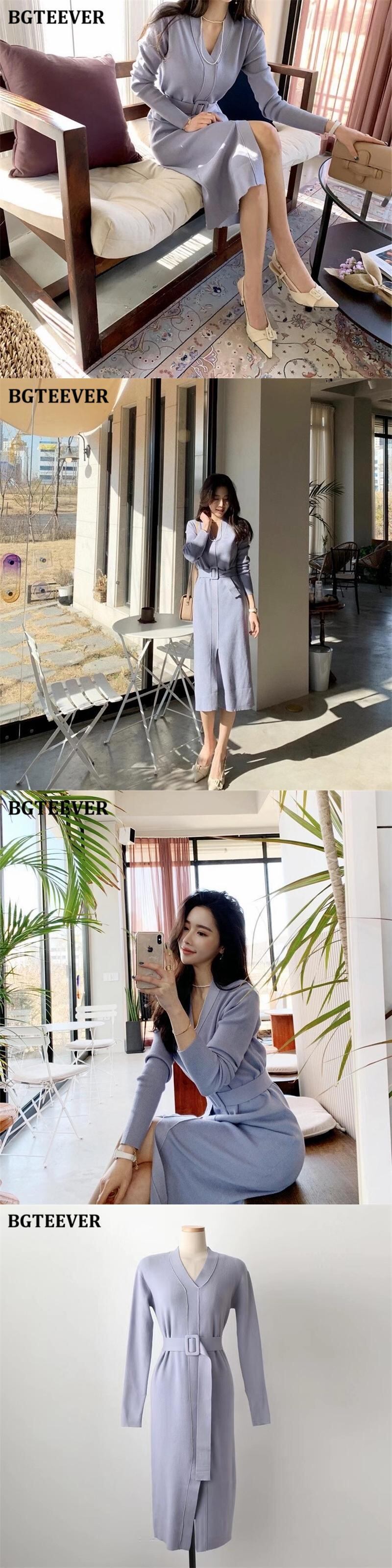 【新作】【送料無料】 BGTEEVERVネックサッシベルトニットドレス女性2020フルスリーブベルトセーターミディドレスニットVestidos ハーネス 12b172630644308