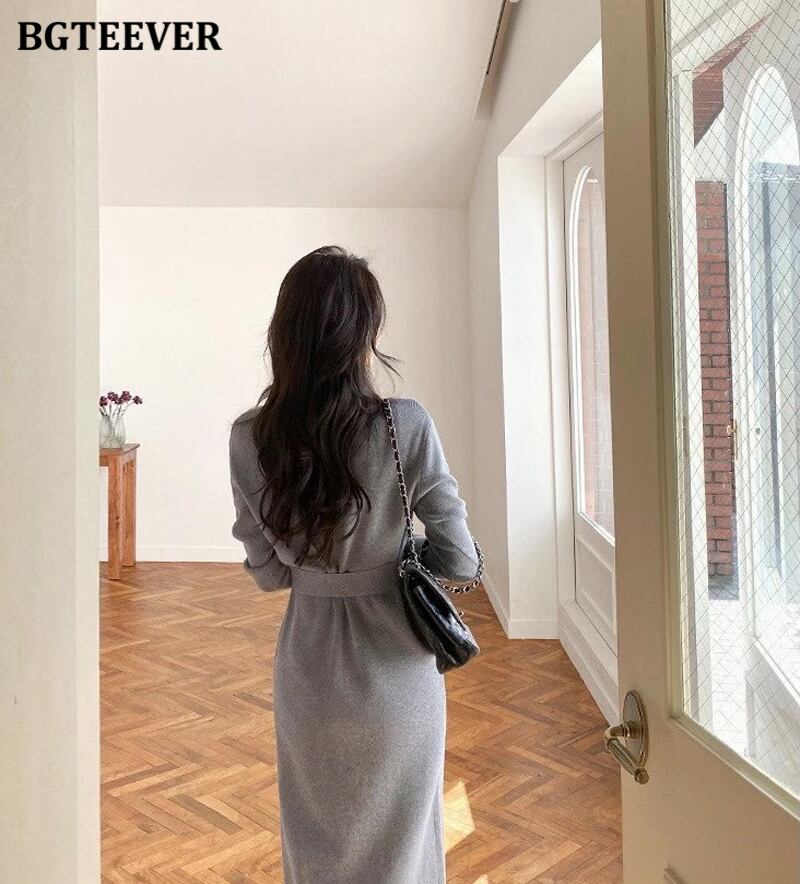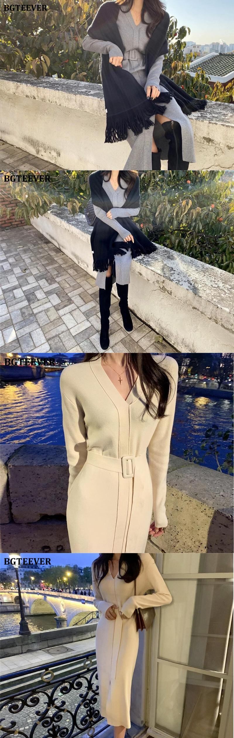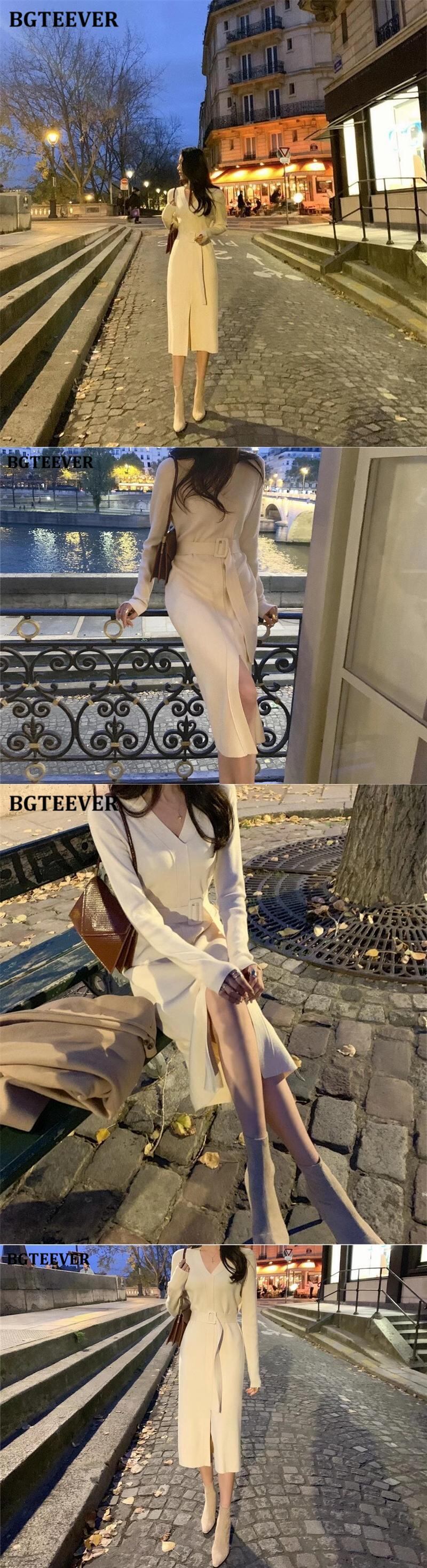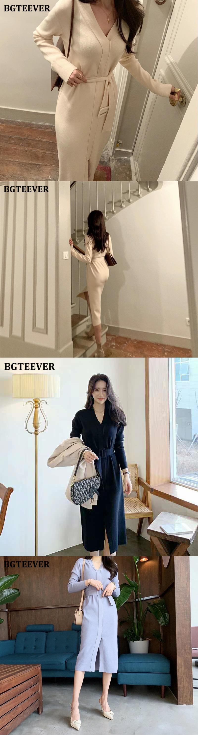 【新作】【送料無料】 BGTEEVERVネックサッシベルトニットドレス女性2020フルスリーブベルトセーターミディドレスニットVestidos ハーネス 12b172630644308