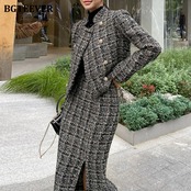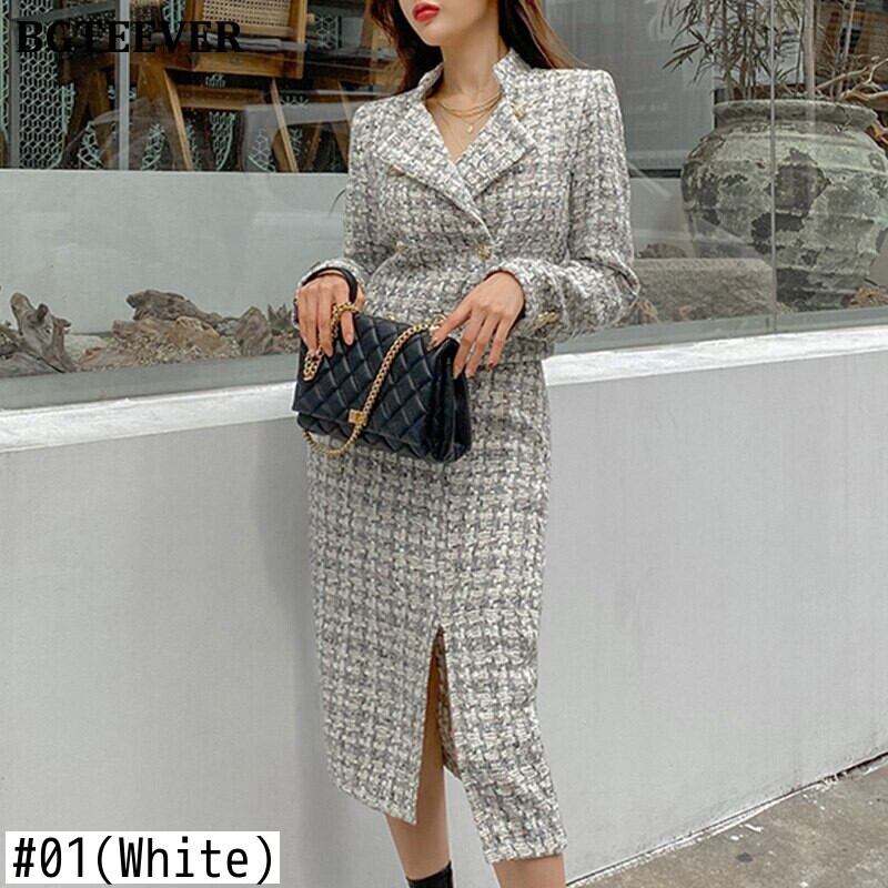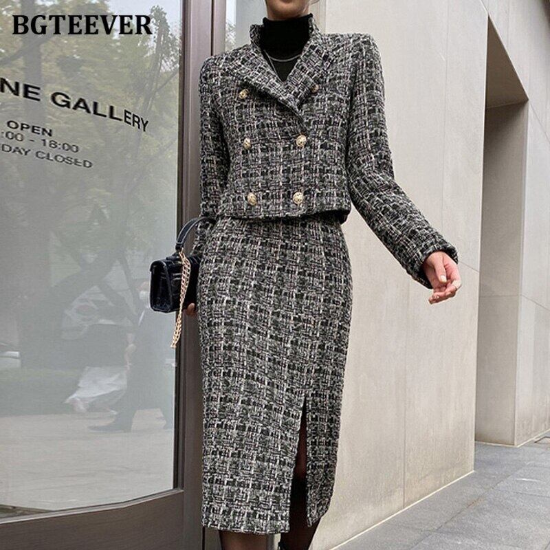 【新作】【送料無料】 冬季OL2ピースセット女性ダブルブレストウールコート&ウエストスプリットボディコンミディスカートスカートスーツ ウィンター 冬物 12b124290958732