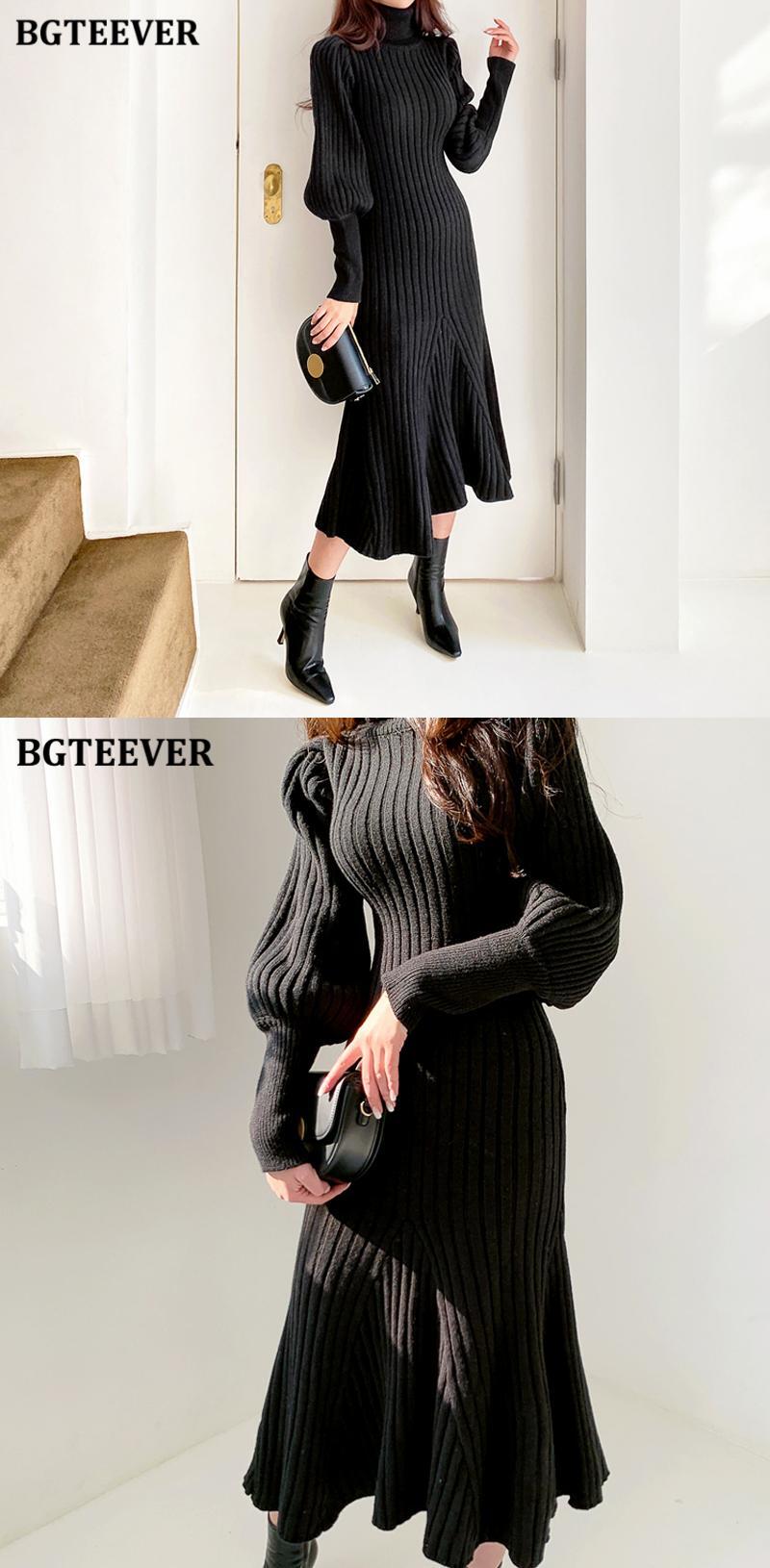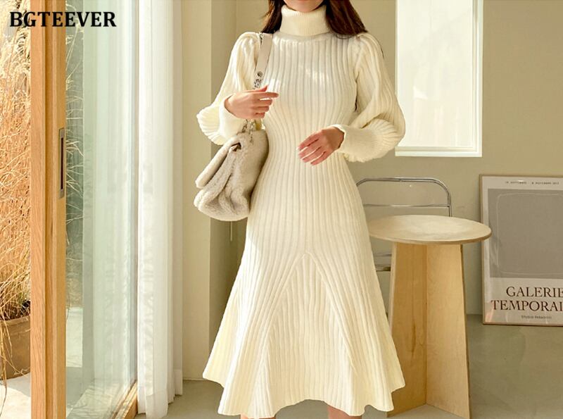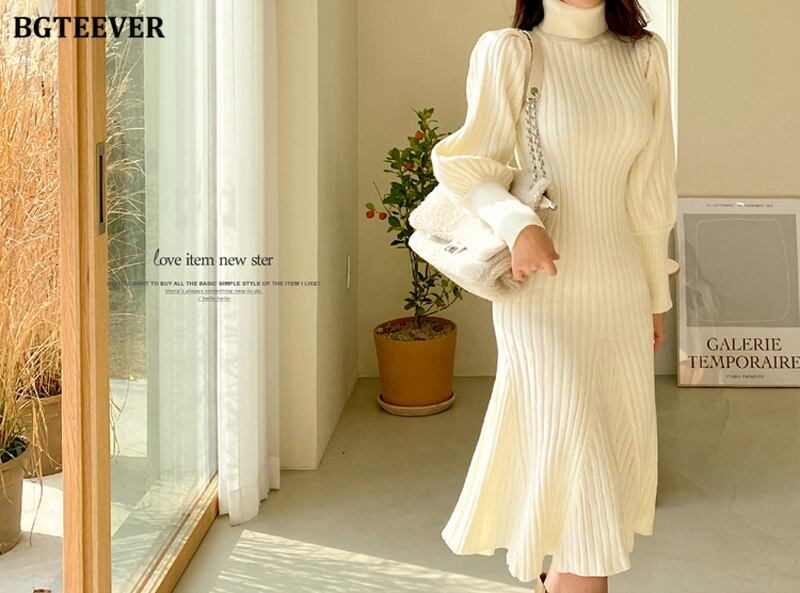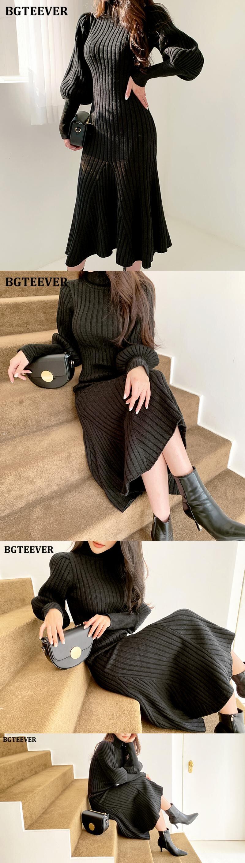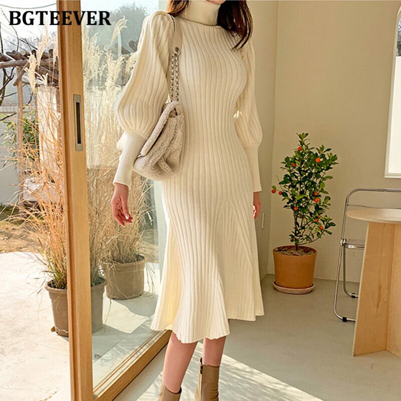 【新作】【送料無料】 BGTEEVER冬タートルネック厚手の女性ニットミドル丈ドレスヴィンテージパフスリーブスリムウエストセータードレス2020 ウィンター 冬物 ビンテージ 12b180325773869