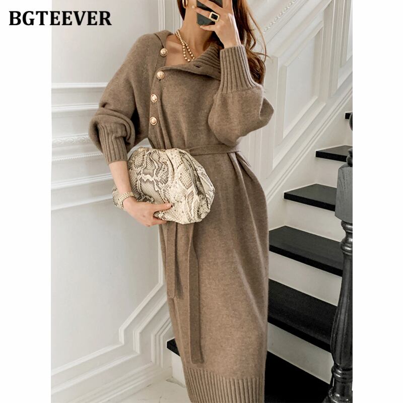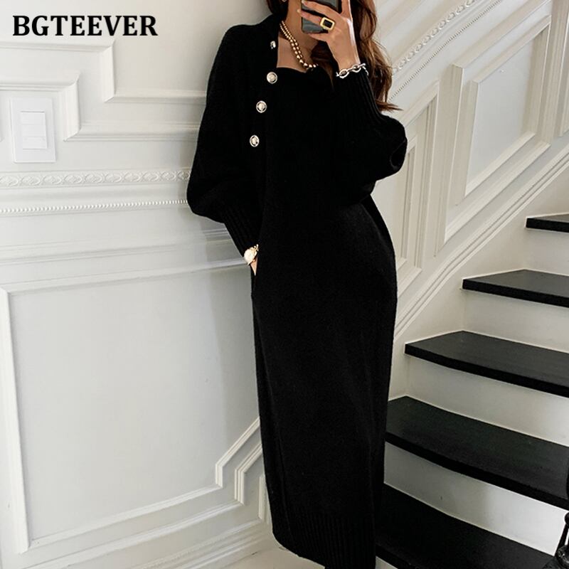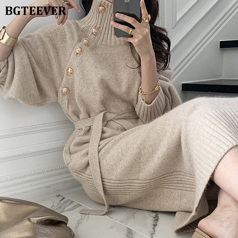 【新作】【送料無料】 冬のタートルネックボタン女性ニットミドル丈ドレスレースアップルーズセータードレスロングVestidos ウィンター 冬物 12b199814651374