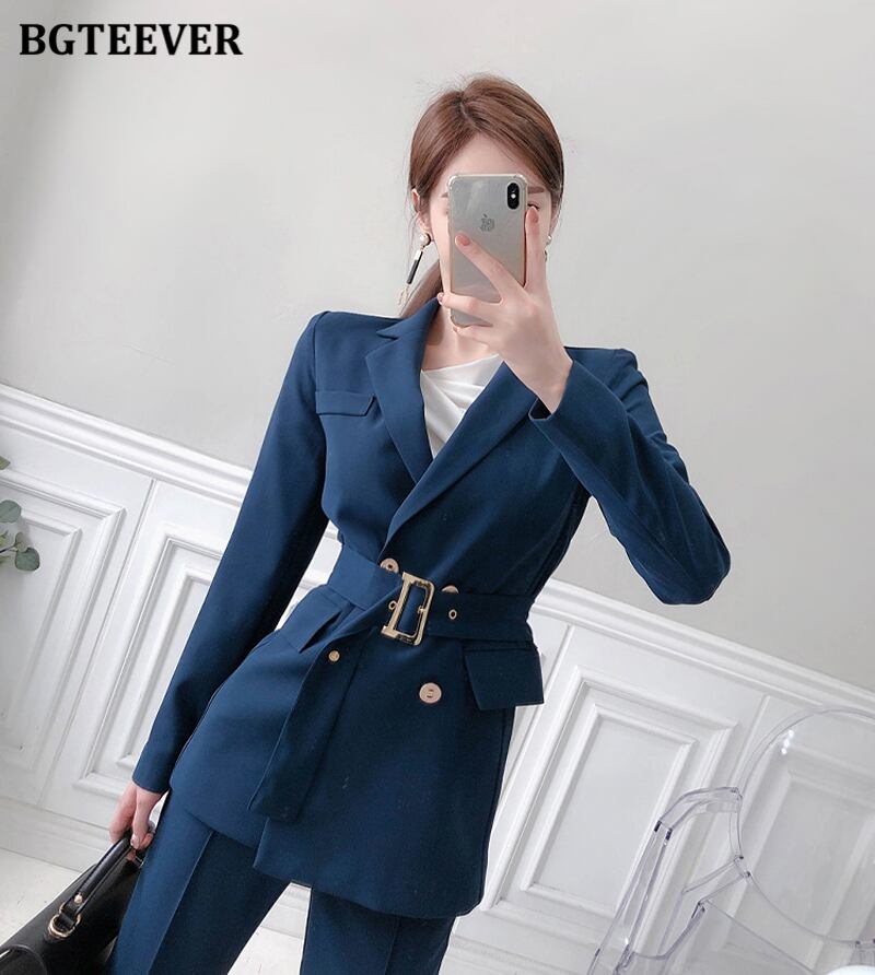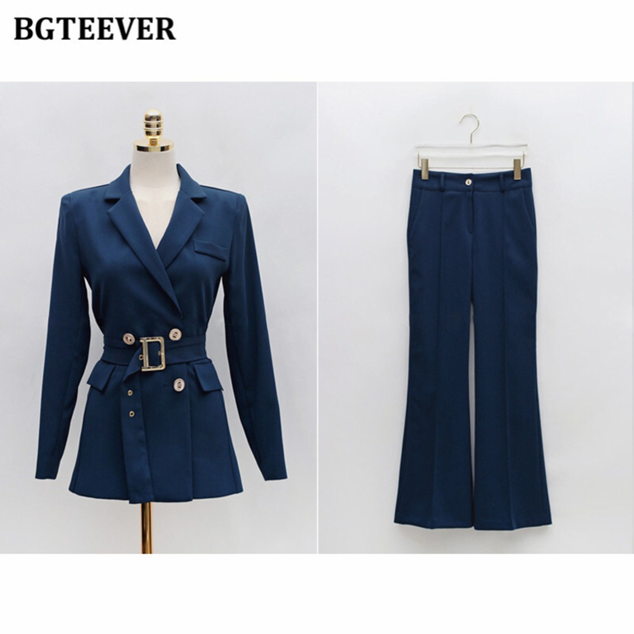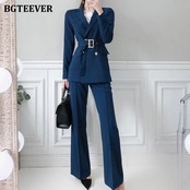 【新作】【送料無料】 BGTEEVERオフィスパンツスーツダブルブレストベルトブレザー&フレアパンツ2020秋女性2ピースブレザーセット オータム 秋物 ハーネス 会社 学校 通勤や通学にも 12b137381496762