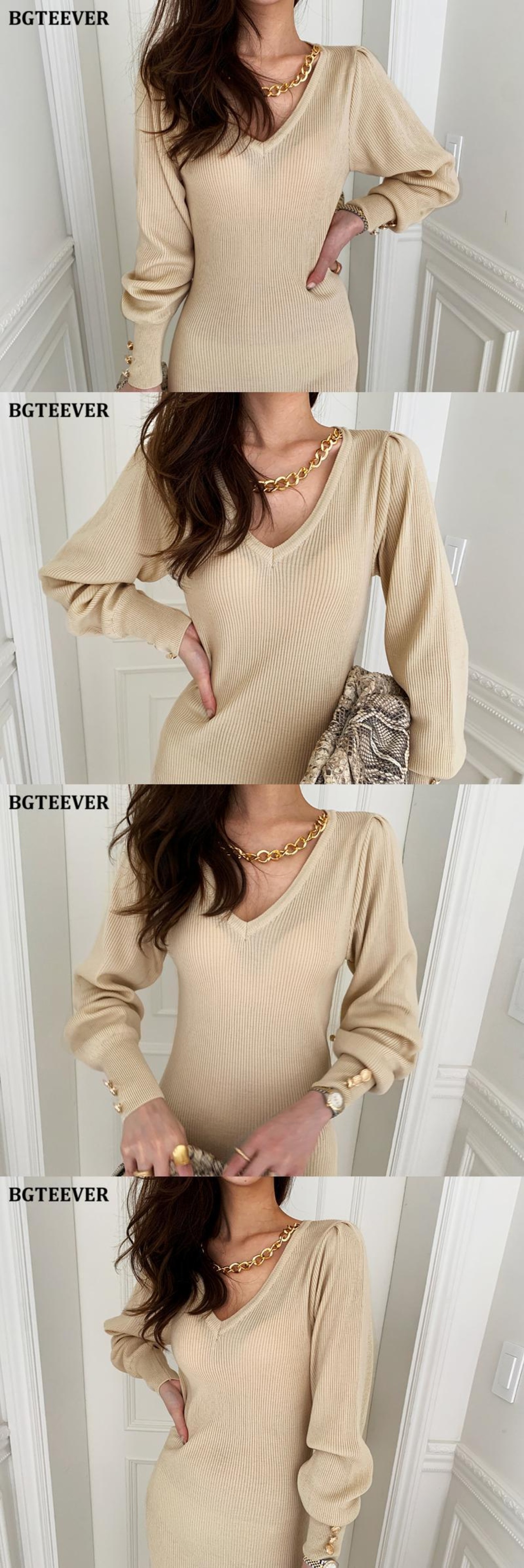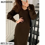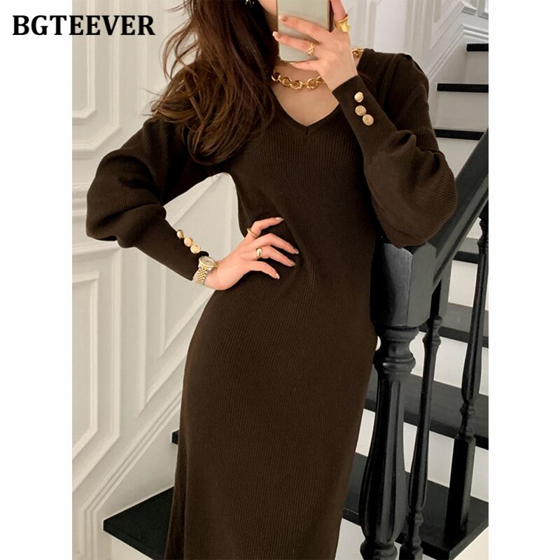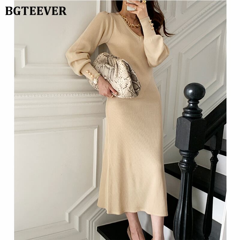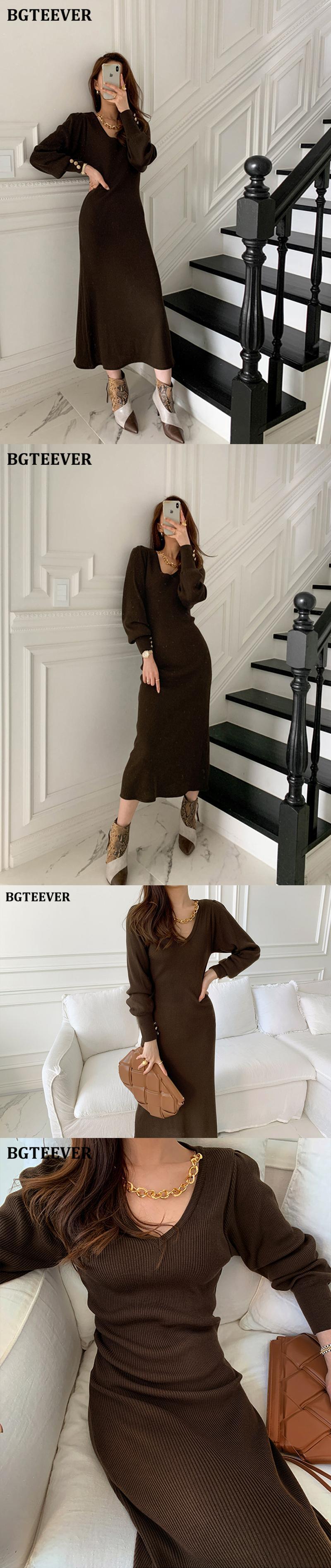 【新作】【送料無料】 BGTEEVER冬Vネック厚手ロングニットドレス女性2020フルスリーブAラインセーターVestidosソリッドドレス ウィンター 冬物 ソリッドカラー 12b118056569122