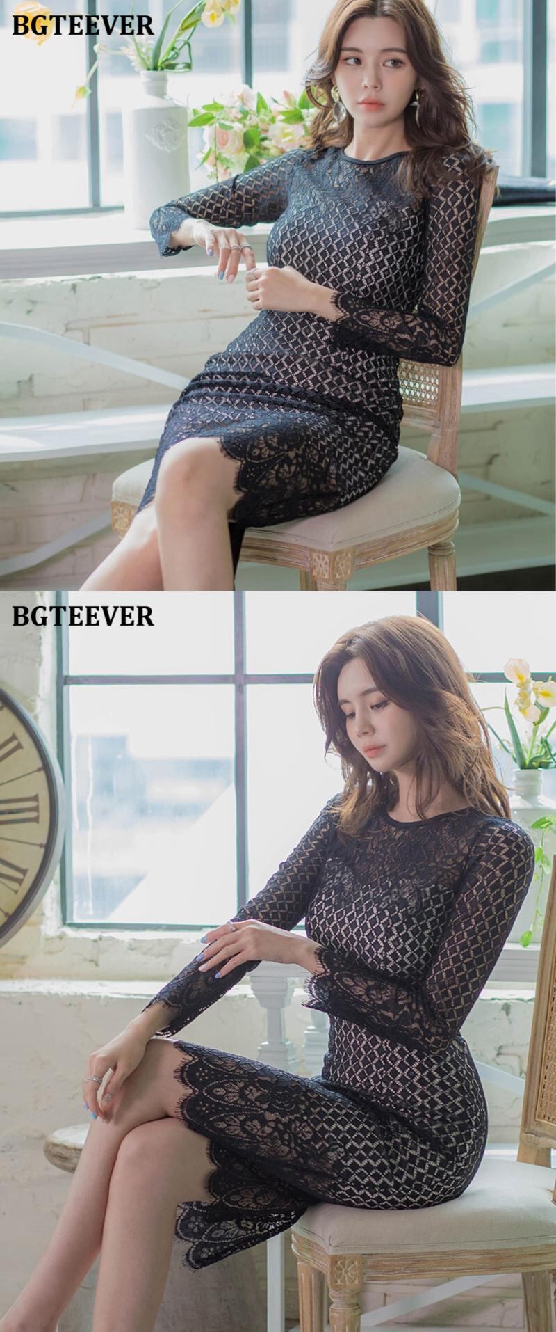 【新作】【送料無料】 BGTEEVERスタイリッシュなOネックレースパッチワークスキニーシースドレスレディーススリムウエストパッケージヒップミディヴェスティドス2020 12b149752642759