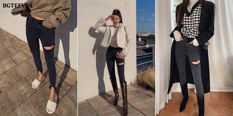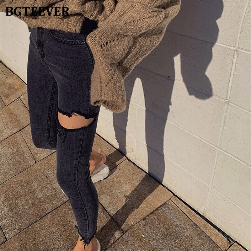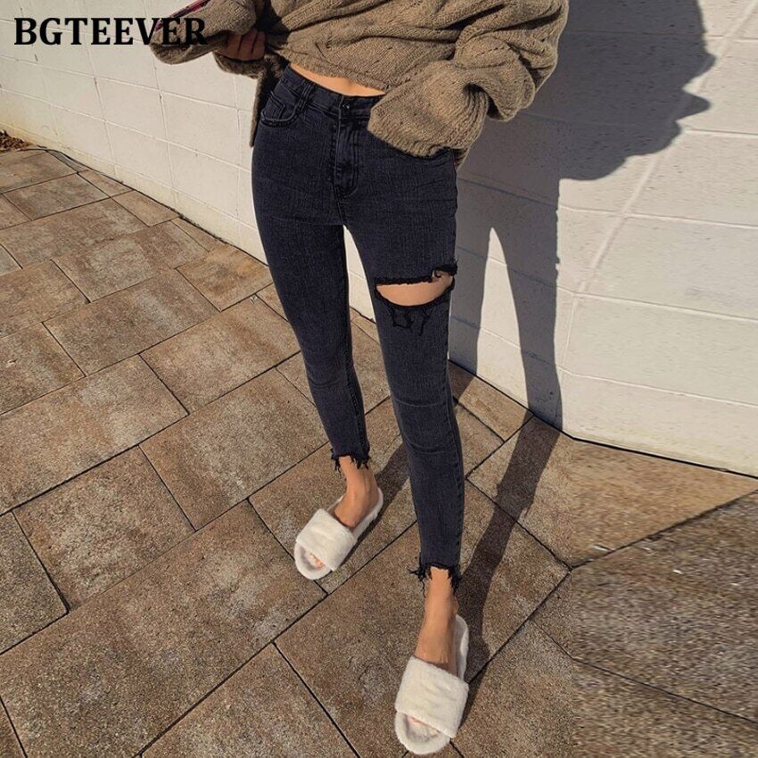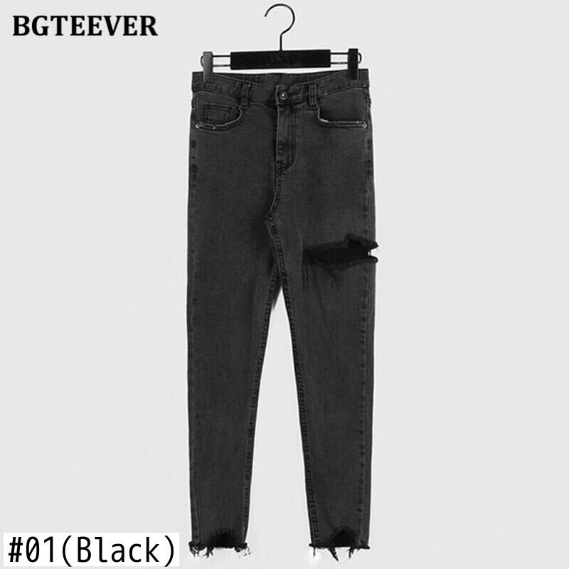 【新作】【送料無料】 BGTEEVERシックな不規則な破れた穴女性ペンシルデニムジーンズスタイリッシュなウエストストレッチスキニーデニムパンツ2021春 スプリング 春物 12b132520300790