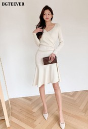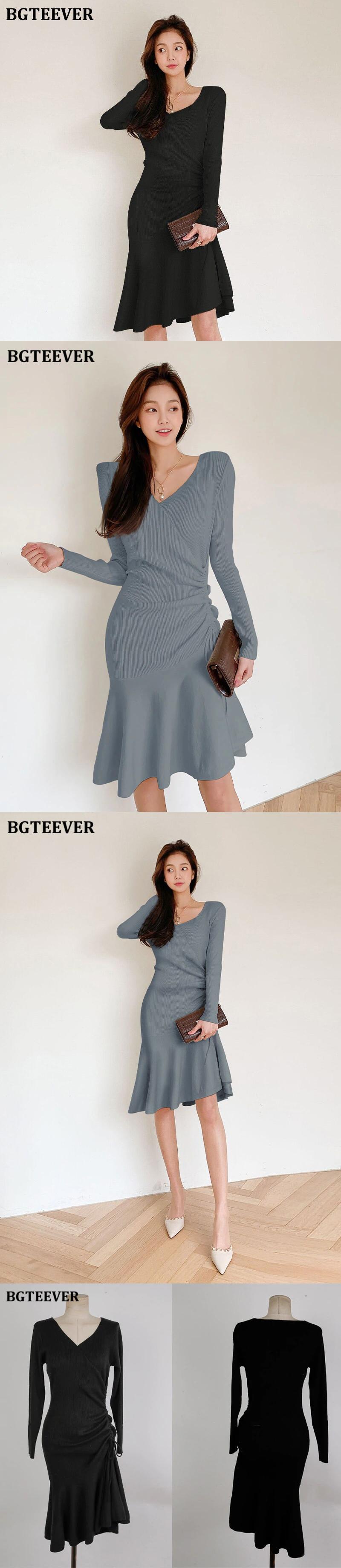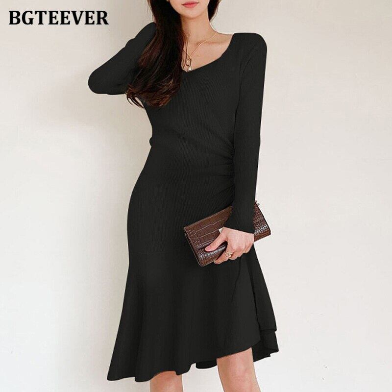 【新作】【送料無料】 BGTEEVER秋冬女性巾着ニットミドル丈ドレスVネックマーメイドセータードレス2020Vestidos femme オータム 秋物 ウィンター 冬物 フェミニン 12b151547832184