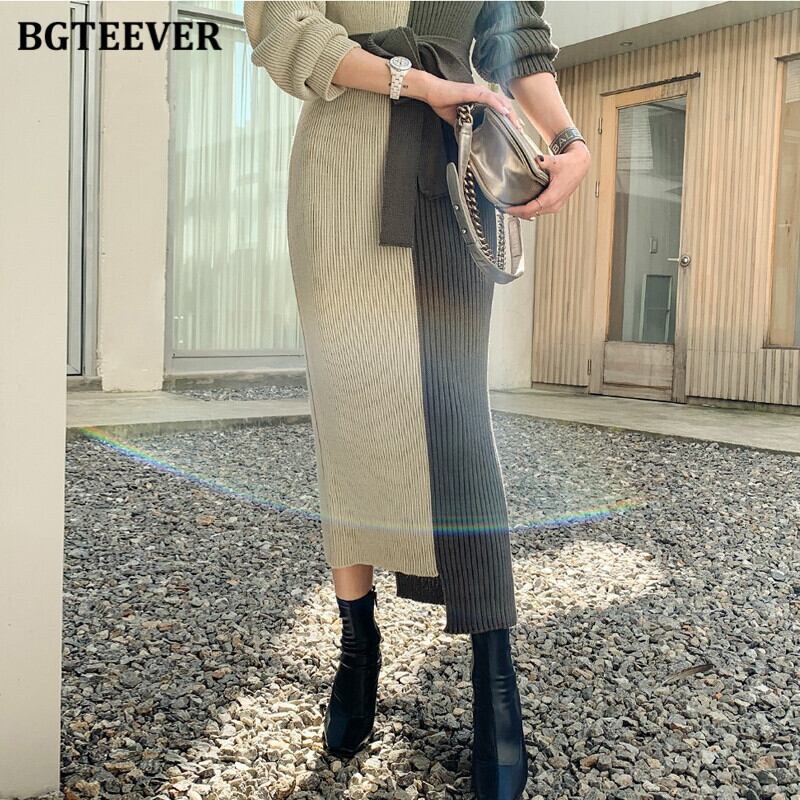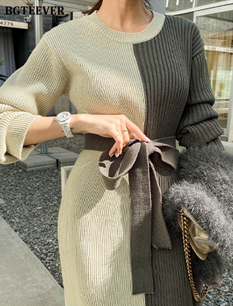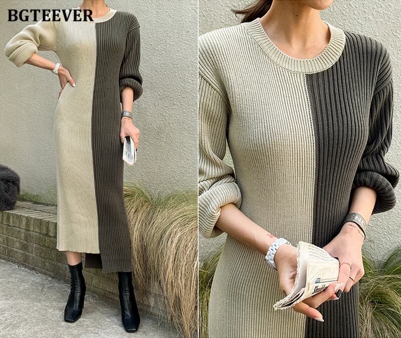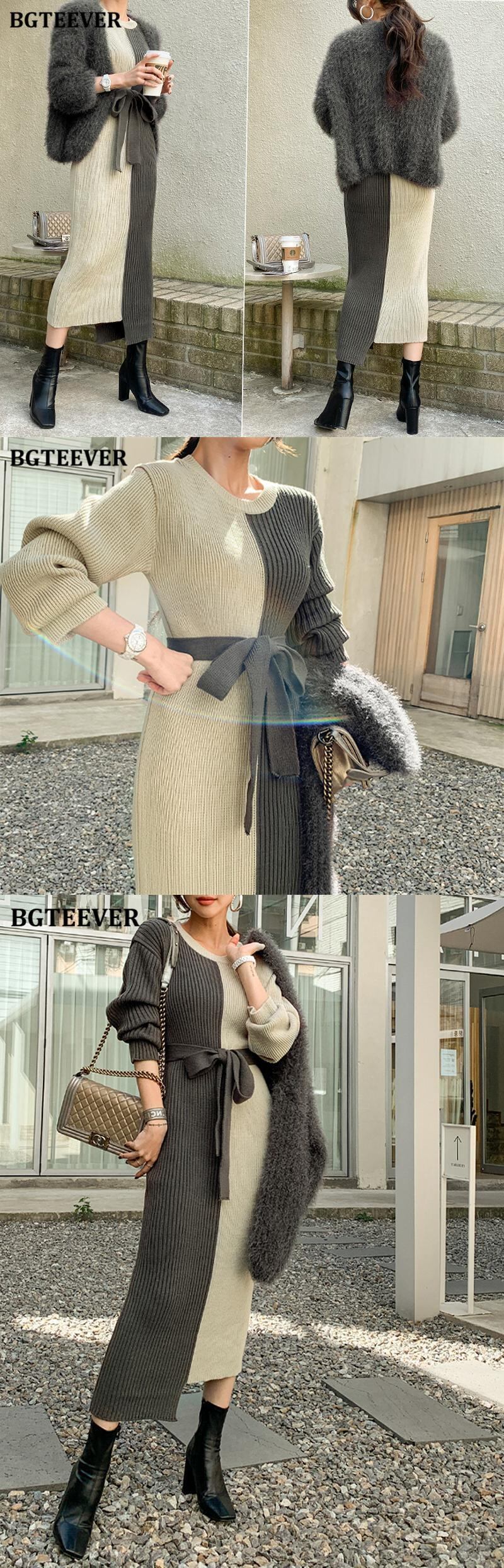 【新作】【送料無料】 BGTEEVEROネック長袖女性パッチワークニットドレス秋冬不規則なレースアップロングセータードレス2020 オータム 秋物 ウィンター 冬物 12b18049575050