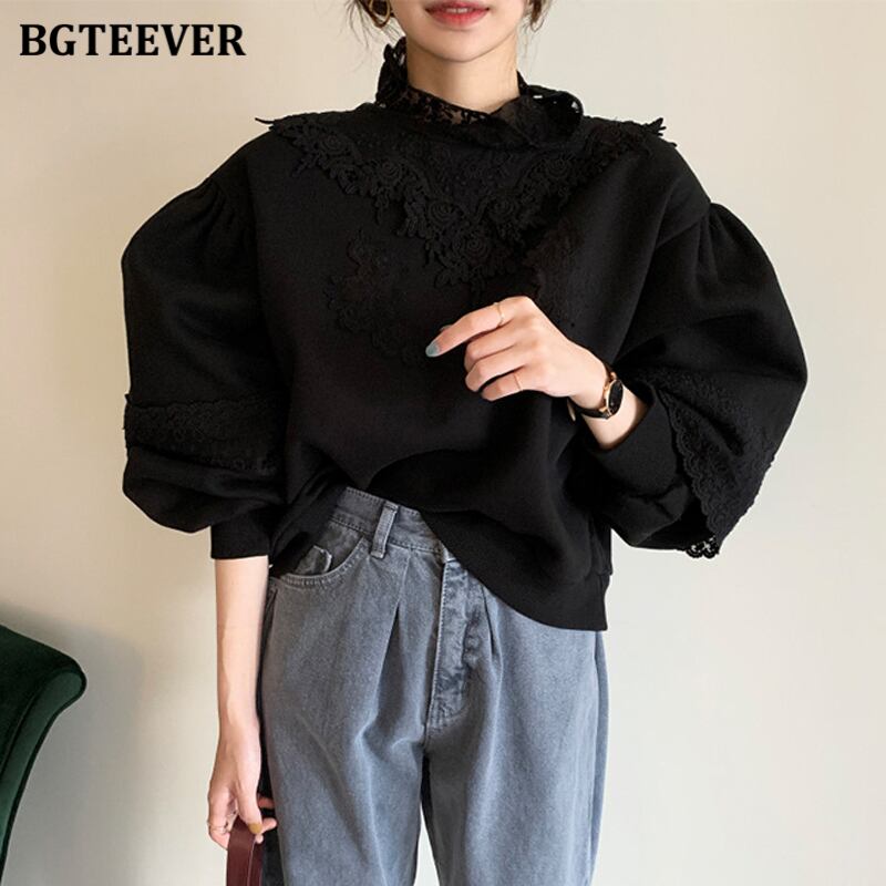【新作】【送料無料】 BGTEEVERスタイリッシュなレースパッチワーク女性フリーススウェットシャツウィンターランタンスリーブ2020ルーズプルオーバーウォームジャケット 冬物 12b119129588880
