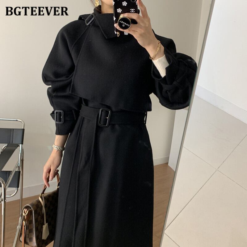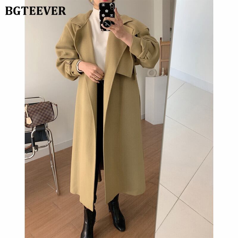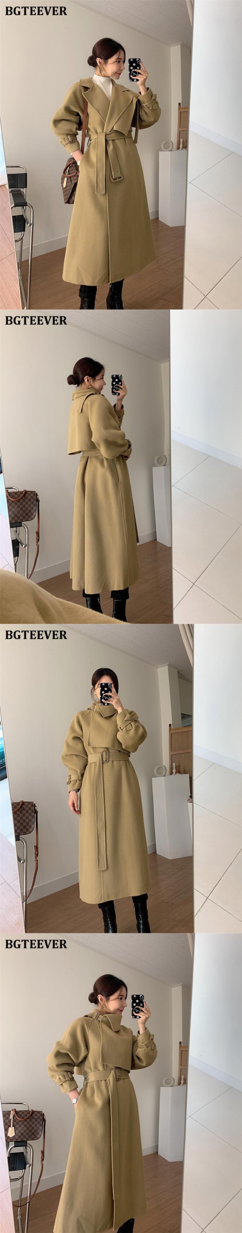 【新作】【送料無料】 BGTEEVERシックなヴィンテージ女性はソリッドブレンドコート2020フルスリーブベルト付きロングオーバーコート冬のウールジャケットを厚くします ウィンター 冬物 ハーネス ソリッドカラー ビンテージ 12b195128955164
