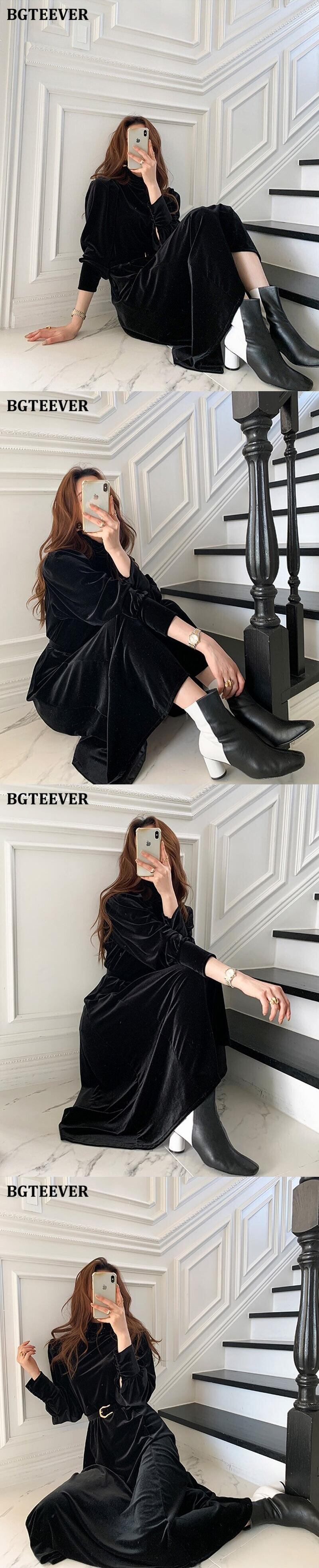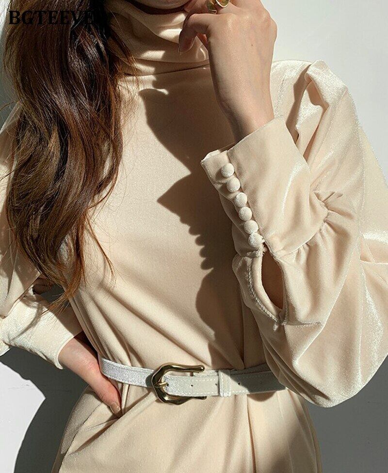 【新作】【送料無料】 BGTEEVERソフトウォームタートルネックレディースベルベットミドル丈ドレス長袖ベルトルーズストレートドレス ロング ハーネス 12b156544093327