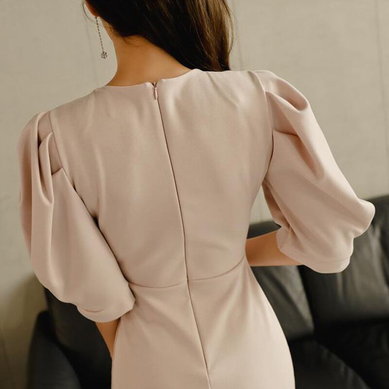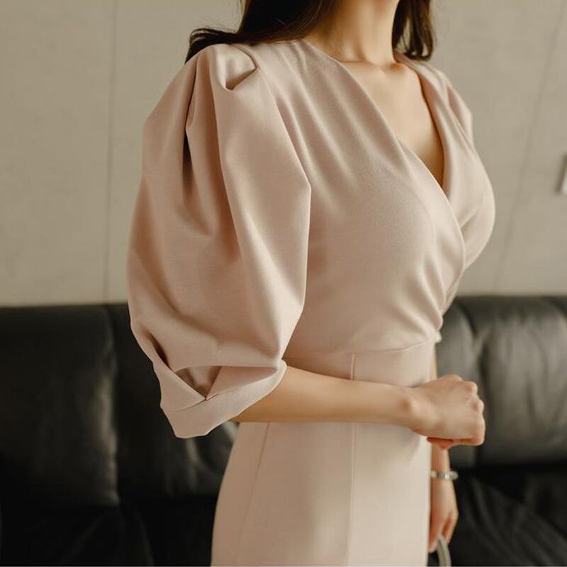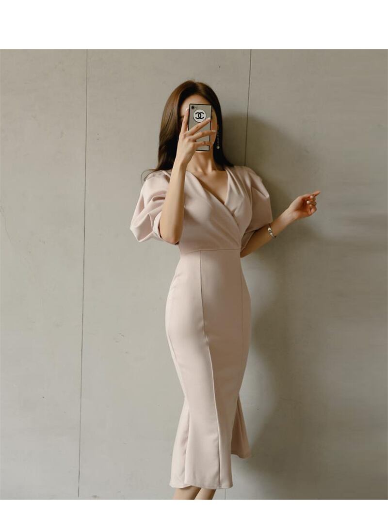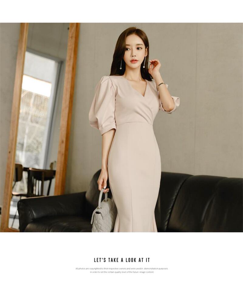 【新作】【送料無料】 ヴィンテージパフスリーブVネックロングレディースドレススリムウエストマーメイドドレス2019パーティートランペットvestidosfemme フェミニン ビンテージ 12b171784502820