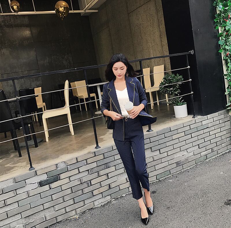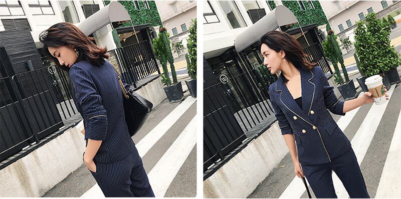 【新作】【送料無料】 ダブルブレストダークブルーストライプパンツスーツレディースVネックブレザージャケット&ペンシルパンツ2点セットOLスイ 12b133893640275