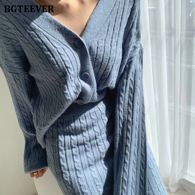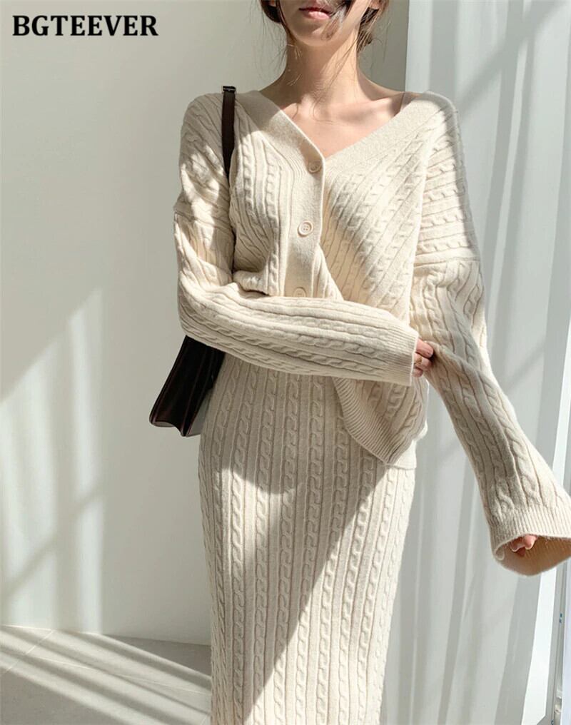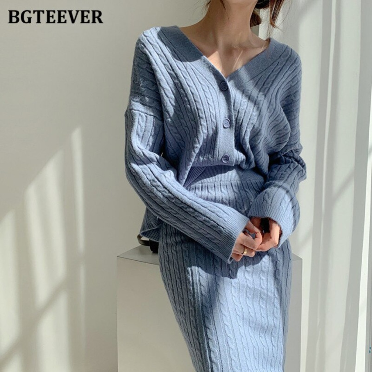 【新作】【送料無料】 BGTEEVERニット2点セットレディースVネックシングルブレストカーディガン&エラスティックウエストペンシルスカートレディース2020セーターセット 伸縮 12b126545473792