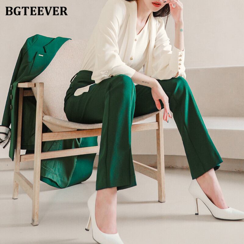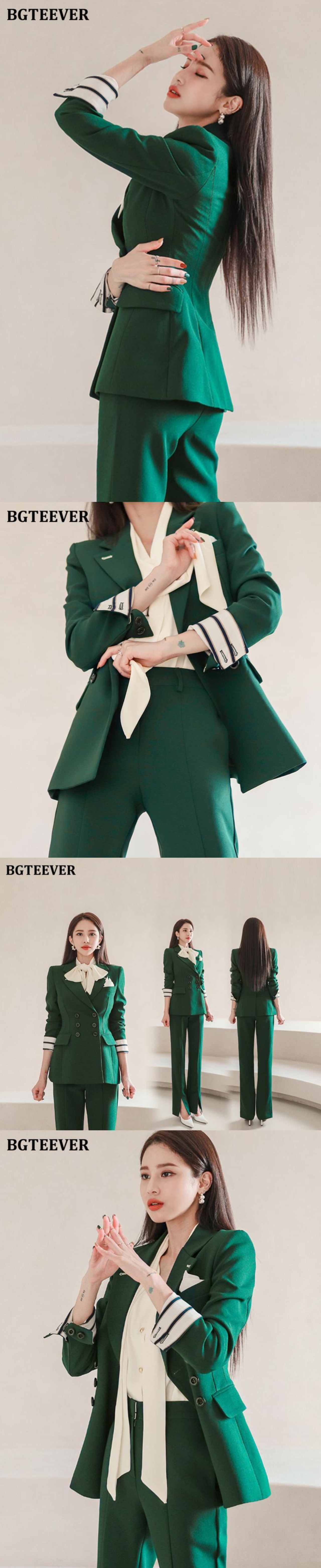 【新作】【送料無料】 BGTEEVERオフィス2ピースパンツスーツグリーンスリムダブルブレザー&スプリットパンツ2020秋女性ブレザーセット オータム 秋物 会社 学校 通勤や通学にも 12b113457274864