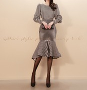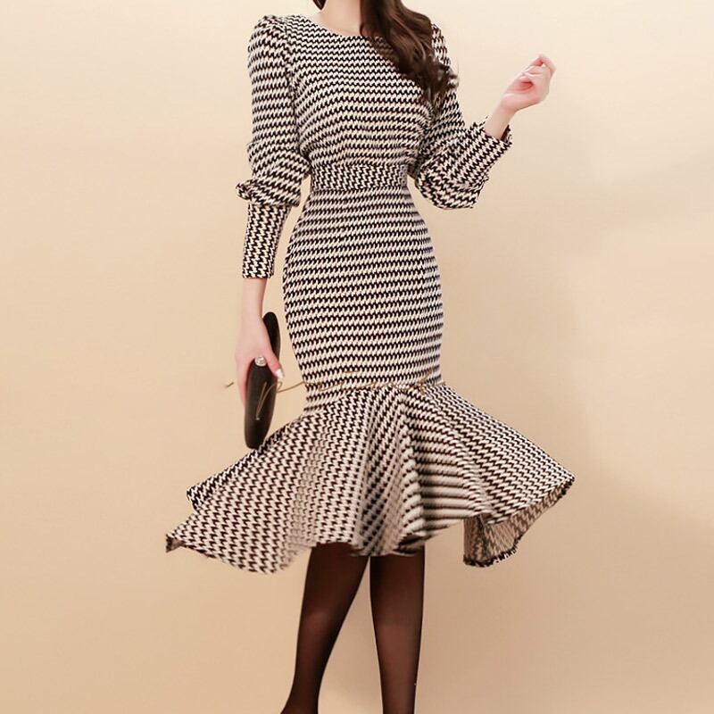 【新作】【送料無料】 2019春女性ラティス2ピーススーツパフスリーブグリッドクロップトップ&マーメイドボディコンスリムウエストスカートOLセット スプリング 春物 12b145654810462