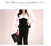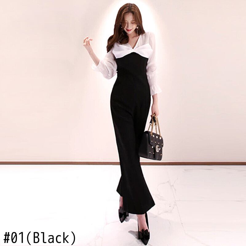 【新作】【送料無料】 Vネックパッチワークレディースジャンプスーツフレアスリーブワークビジネスルーズパンツスリムウエストロングプレイスーツ2019 12b189436657566