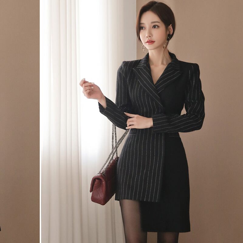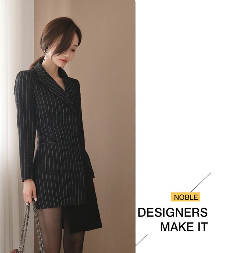【新作】【送料無料】 オフィスストライプ不規則な女性のショートドレスターンダウンカラースリムウエストパッチワークブレザードレス2019 会社 学校 通勤や通学にも 12b152545696854
