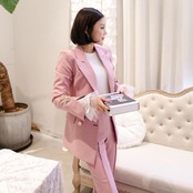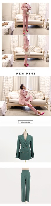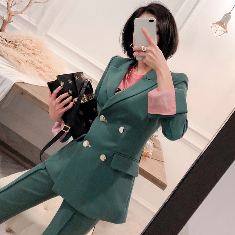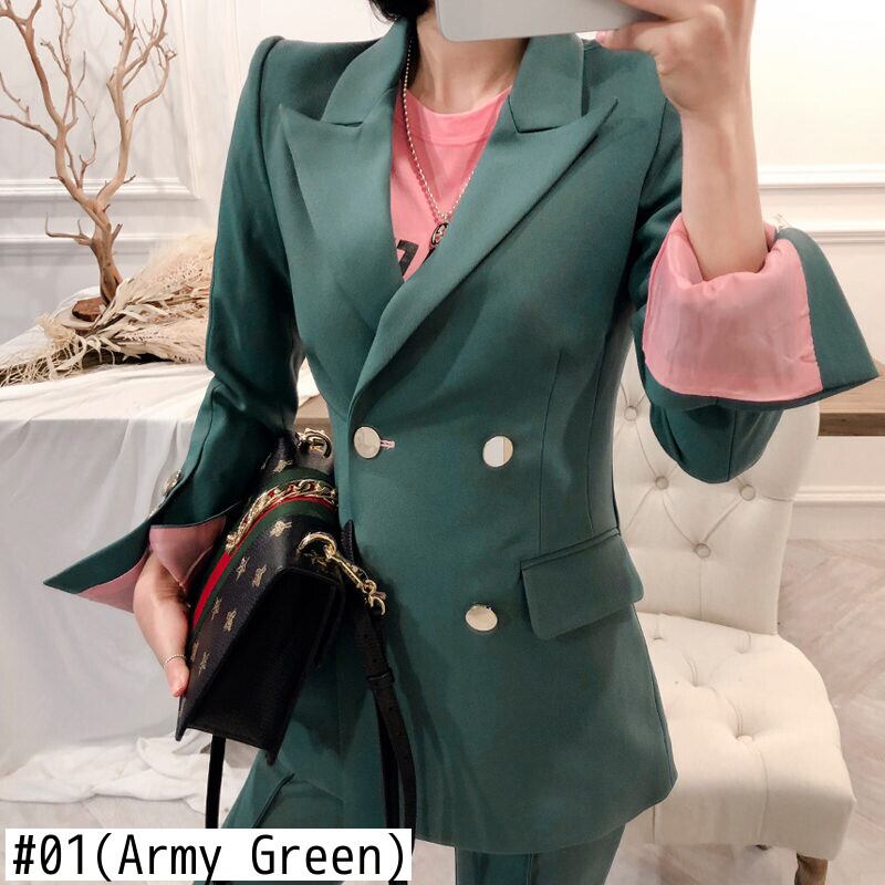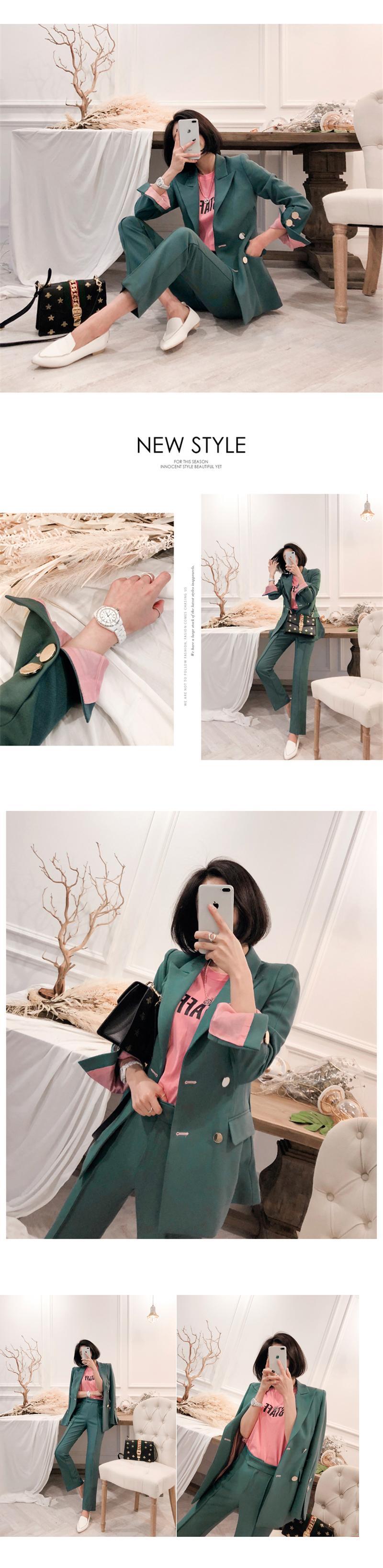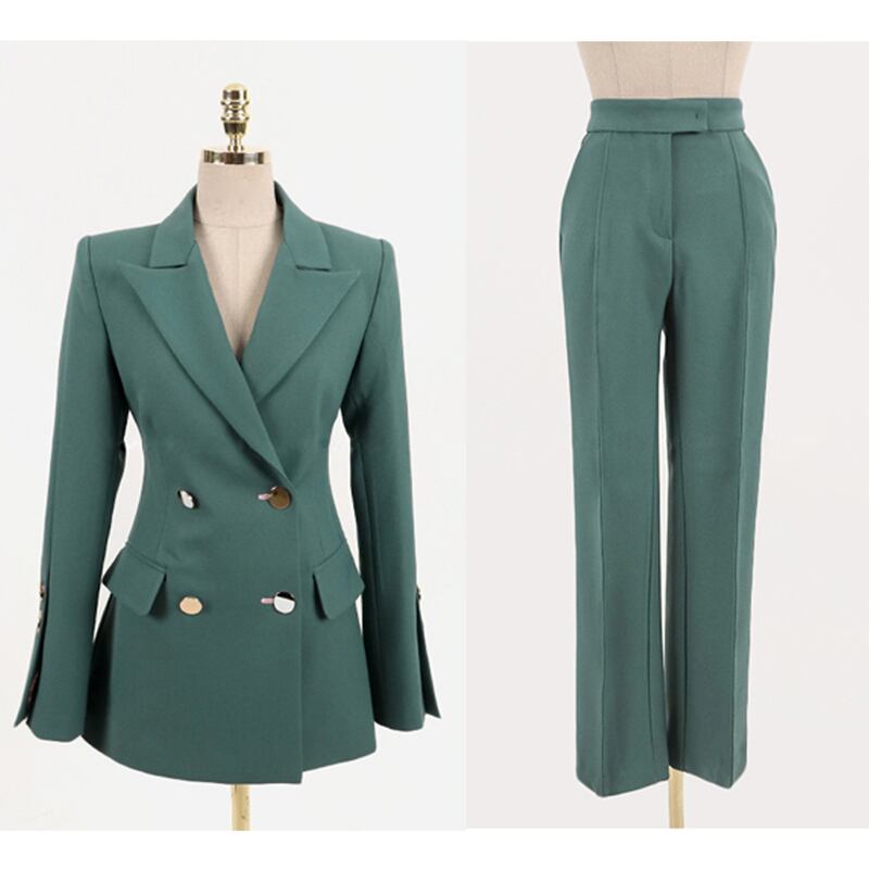 【新作】【送料無料】 グリーンダブルブレストレディースパンツスーツヒットカラーノッチブレザージャケット&ウエストパンツ2019オフィスウェアレディーススーツ 会社 学校 通勤や通学にも 12b193254730884