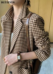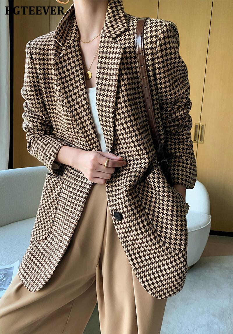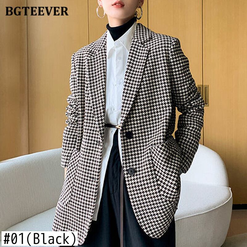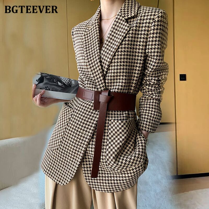 【新作】【送料無料】 BGTEEVERスタイリッシュなノッチカラーの女性千鳥格子ブレザー冬の暖かいシングルブレストベルトジャケットアウター2020 ウィンター 冬物 ハーネス 12b140622970118