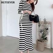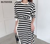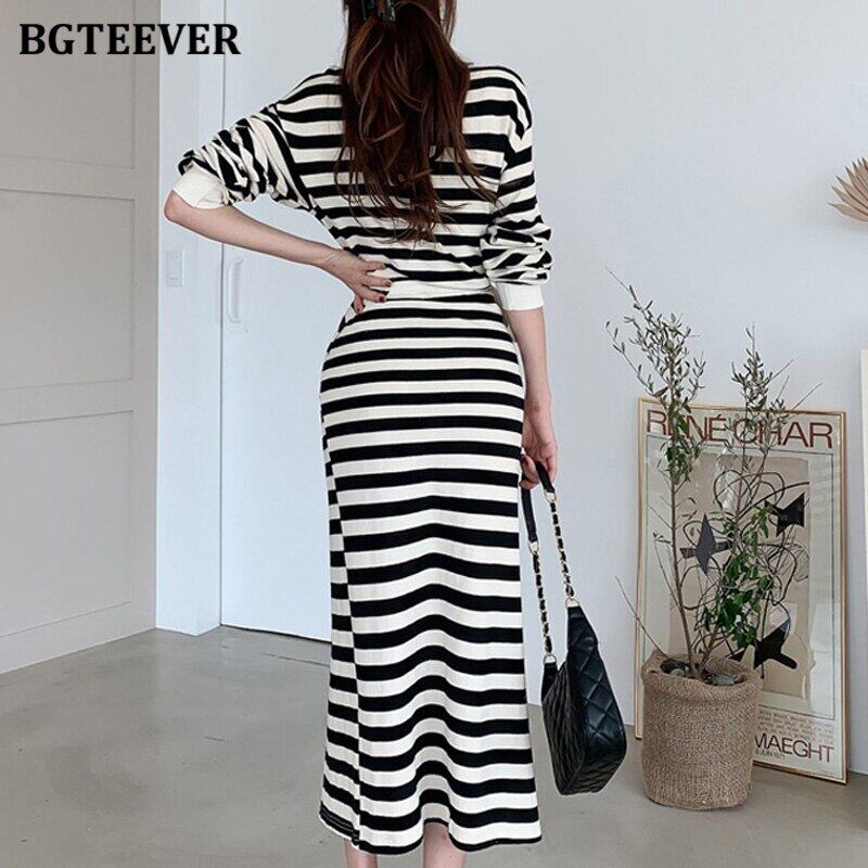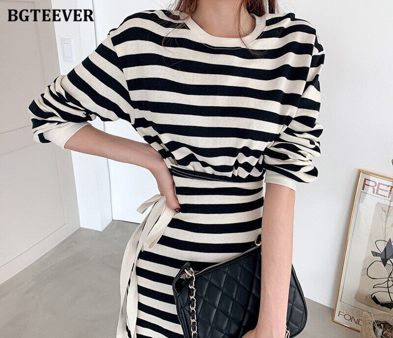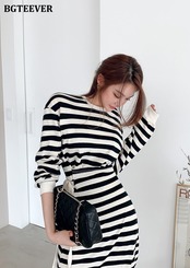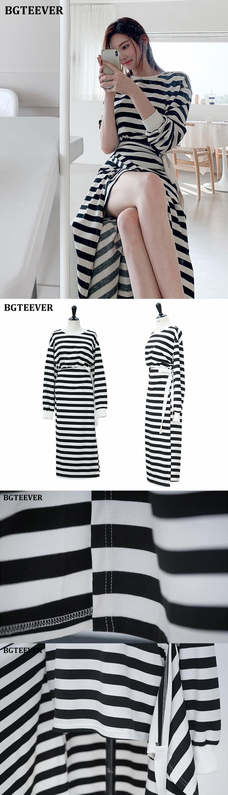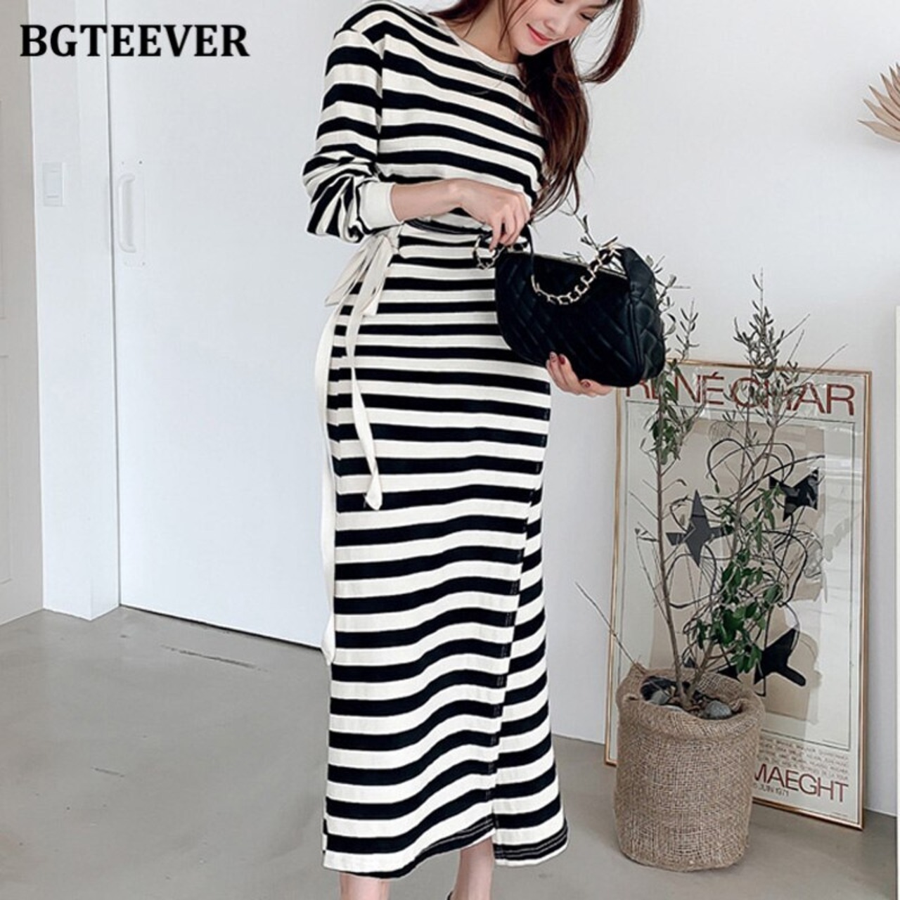 【新作】【送料無料】 BGTEEVEROネックレディースストライプロングドレスフルスリーブレースアップニットドレス秋のスプリットセーターVestidos オータム 秋物 12b164087563252