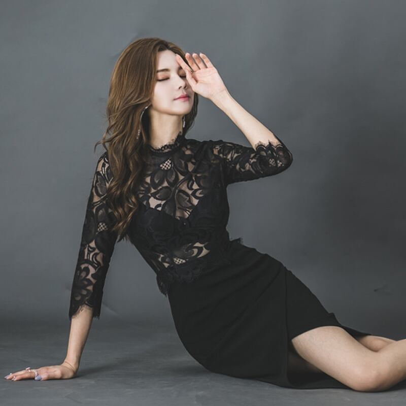 【新作】【送料無料】 セクシーな黒の花柄のレースの女性のボディコンドレス2019Oネック中空ヒップパッケージVestidosシックなミディパーティードレス ブラック 12b118844380242