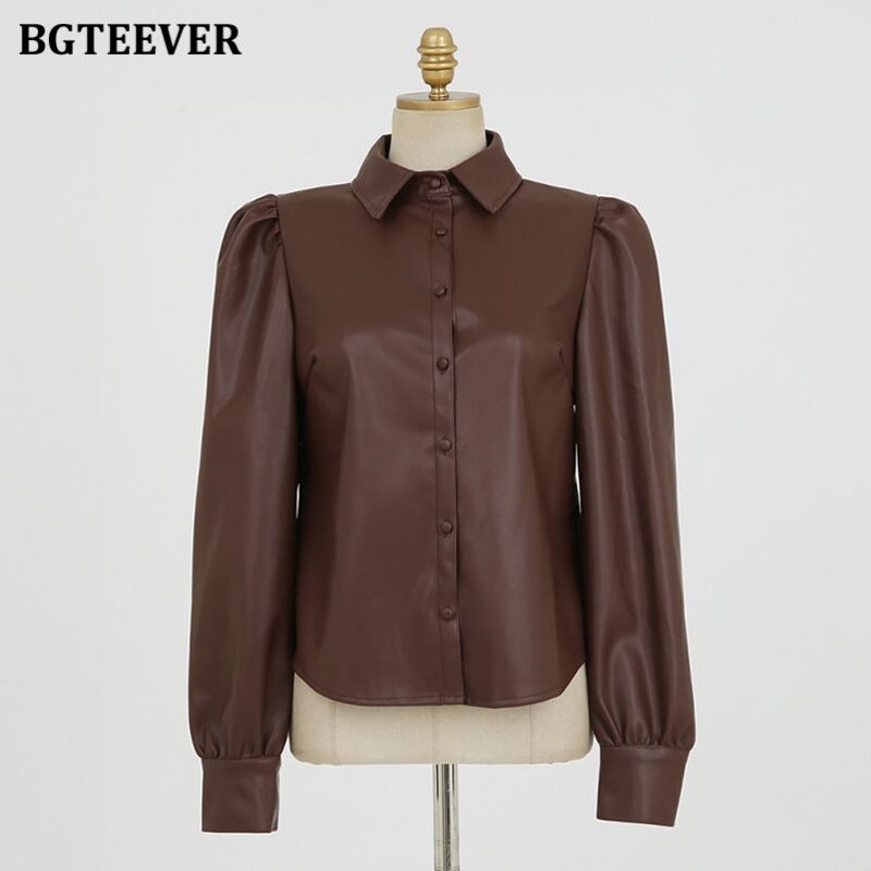 【新作】【送料無料】 BGTEEVERヴィンテージレディースPUレザーシャツ2020秋冬ターンダウンカラーフルスリーブブラウストップス オータム 秋物 ウィンター 冬物 ビンテージ 12b176449272382