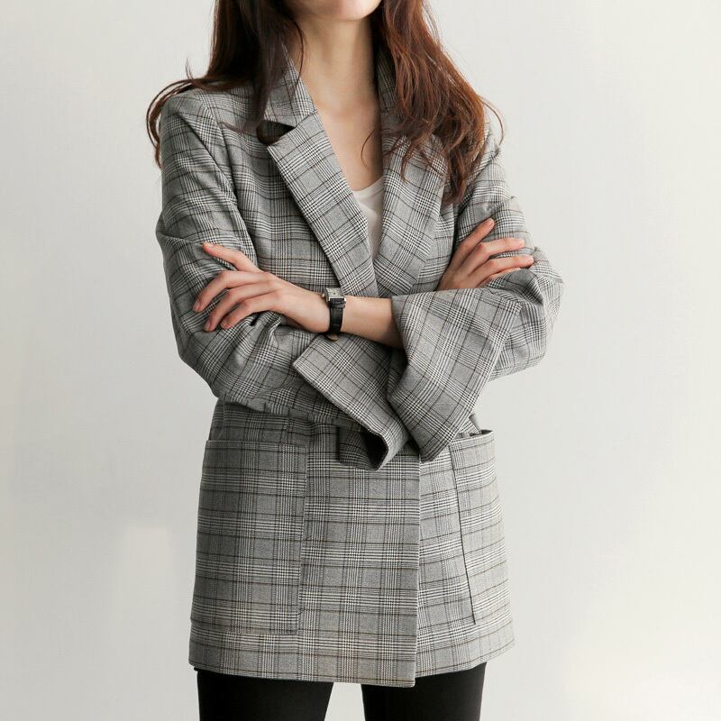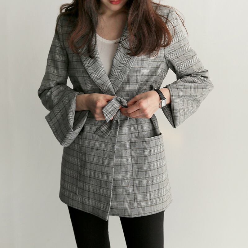 【新作】【送料無料】 ワークグレーチェック柄ブレザージャケットボウサッシスプリットスリーブオフィスブレザーベルト付き女性フェミニノ リボン ハーネス 会社 学校 通勤や通学にも 12b169329583473