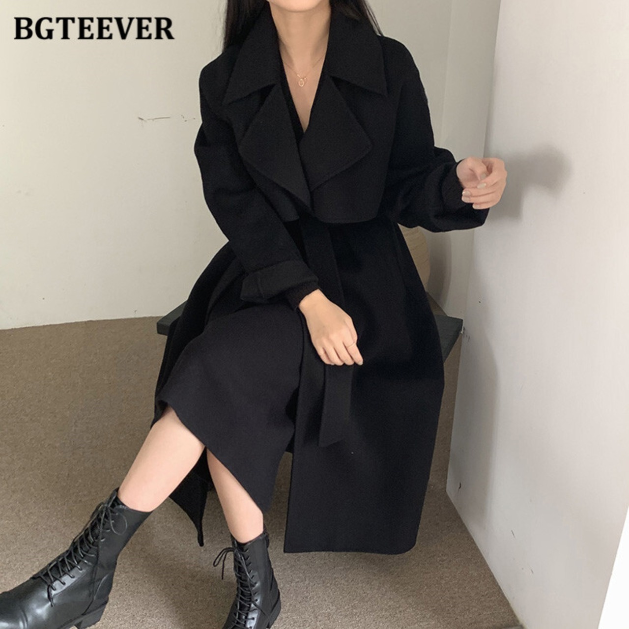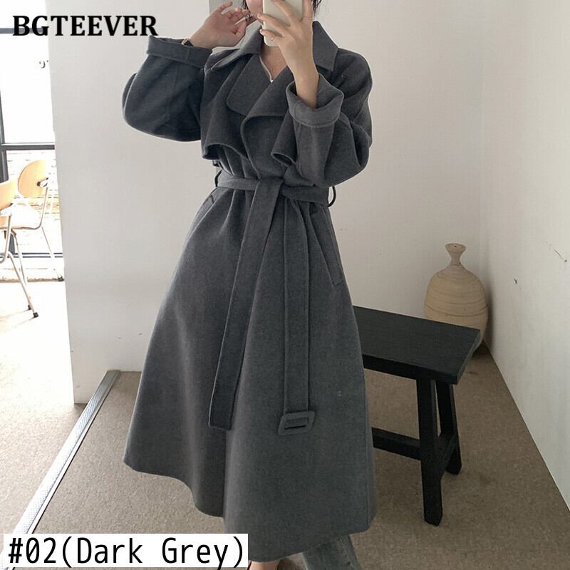 【新作】【送料無料】 BGTEEVERウィンターノッチカラーレディースウールコート厚手のルーズシングルブレストベルト付きレースアップソリッドオーバーコート2020 冬物 ハーネス ソリッドカラー 12b176033800042