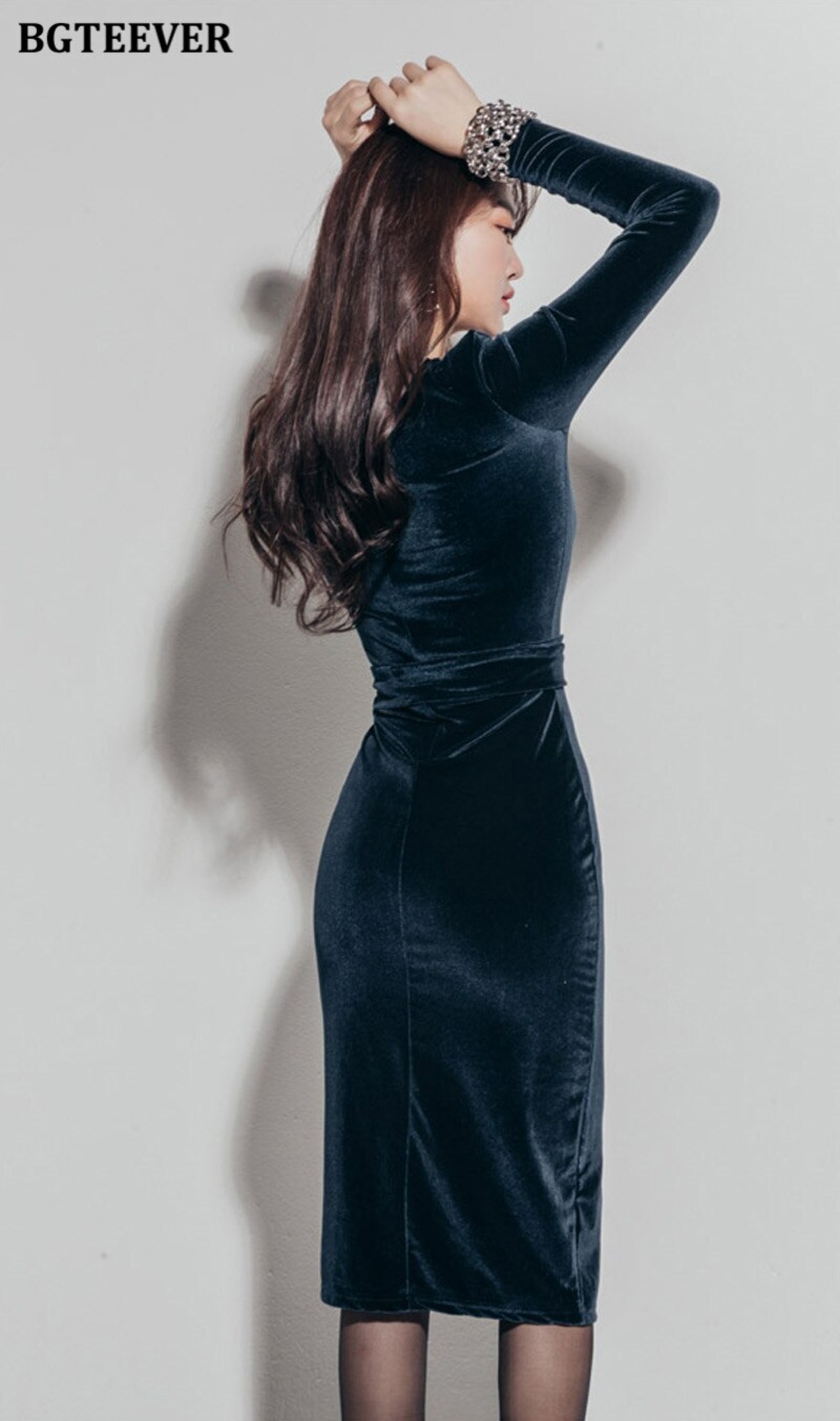 【新作】【送料無料】 BGTEEVERスタイリッシュシックOネックレディースパッケージヒップドレス2020秋冬スリムウエストベルベットベルトスプリットボディコンVestidos オータム 秋物 ウィンター 冬物 ハーネス 12b164076994029