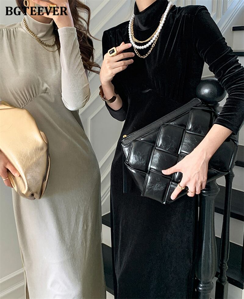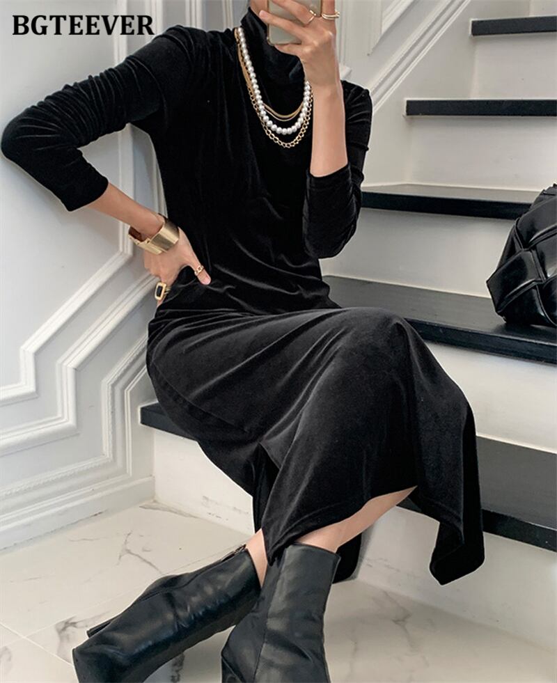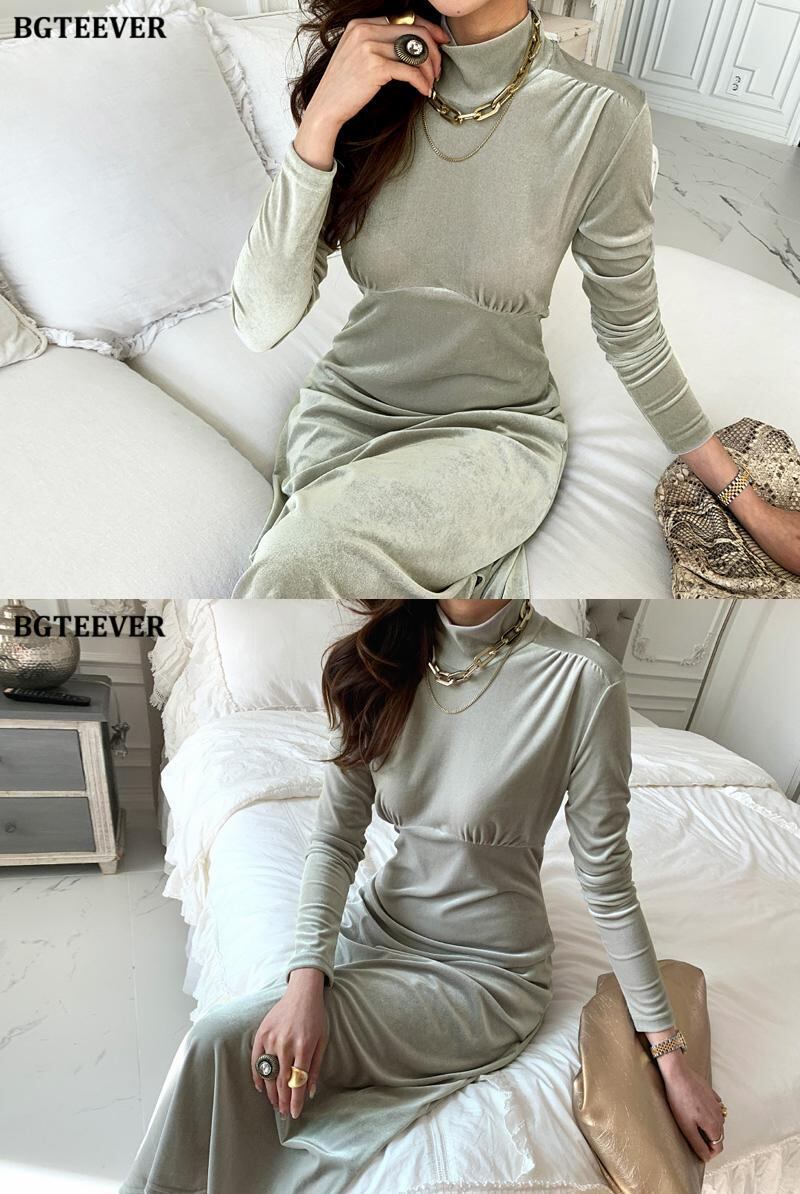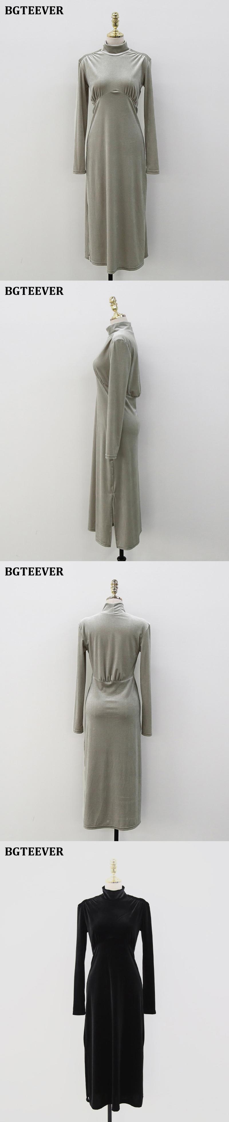 【新作】【送料無料】 BGTEEEVRヴィンテージハーフタートルネックソリッドロングドレス女性フルスリーブスリムウエストベルベットボディコンドレスVestidos ソリッドカラー ビンテージ 12b129221439057
