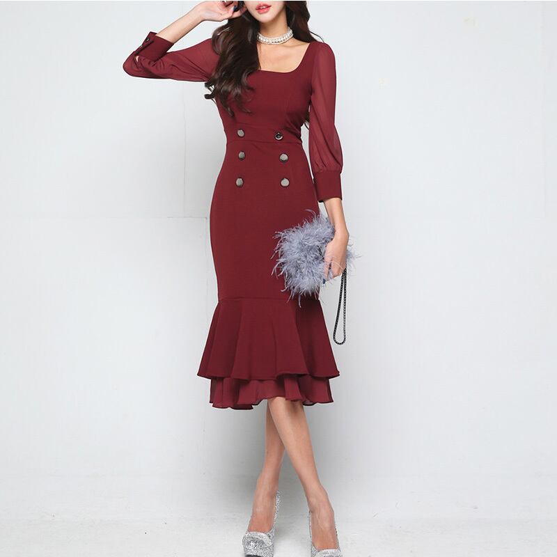 【新作】【送料無料】 ヴィンテージスクエアカラーランタンスリーブフリルレディースパーティードレスダブルブレストスリムウエストミドル丈マーメイドドレス2019 ラッフル スクウェア ビンテージ 12b153373714580