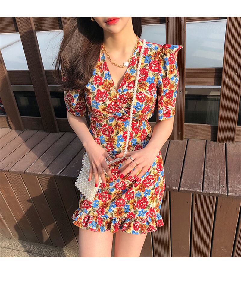 【新作】【送料無料】 ヴィンテージフローラルプリントレディースショートドレスVネックスリムウエストマーメイドドレスサマーシースミニVestidosfemme 2019 夏物 花柄 フェミニン ビンテージ 12b165536813640
