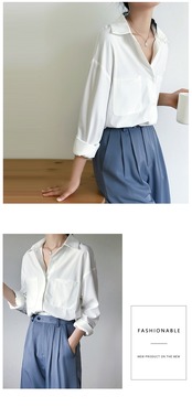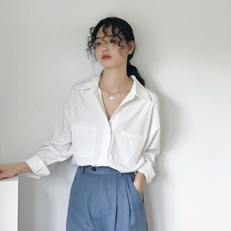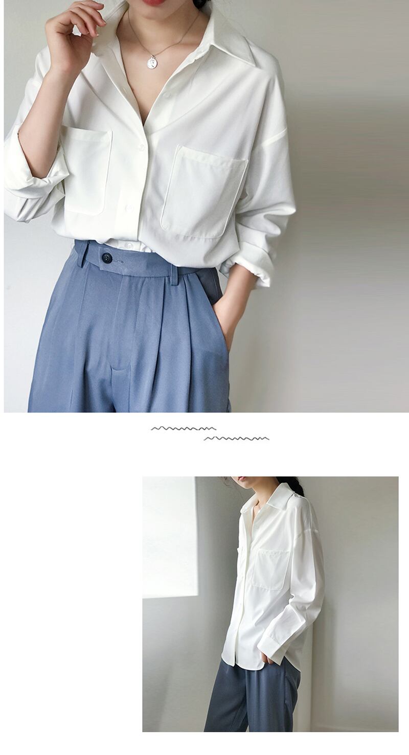 【新作】【送料無料】 OLスタイルの白いシャツ女性のターンダウンカラーポケット女性のブラウストップスワークウェアトップス秋 ホワイト オータム 秋物 フェミニン 12b134286324298