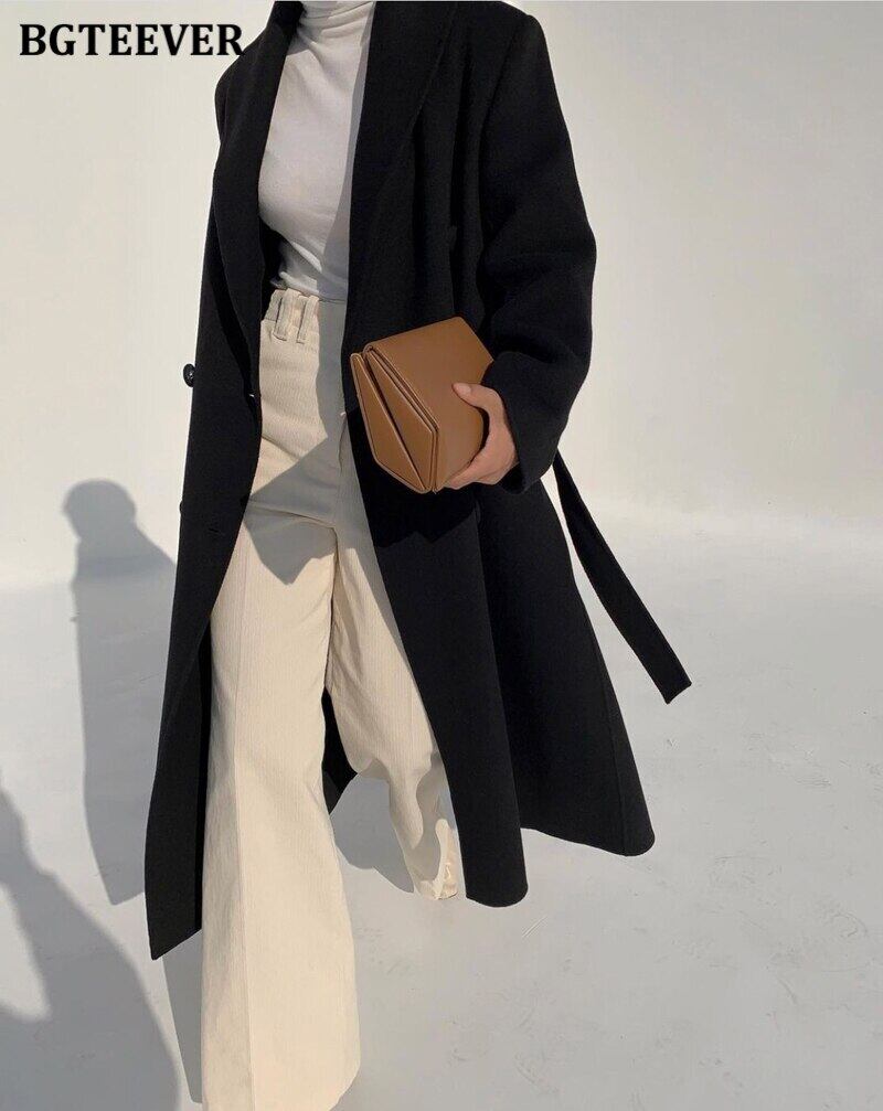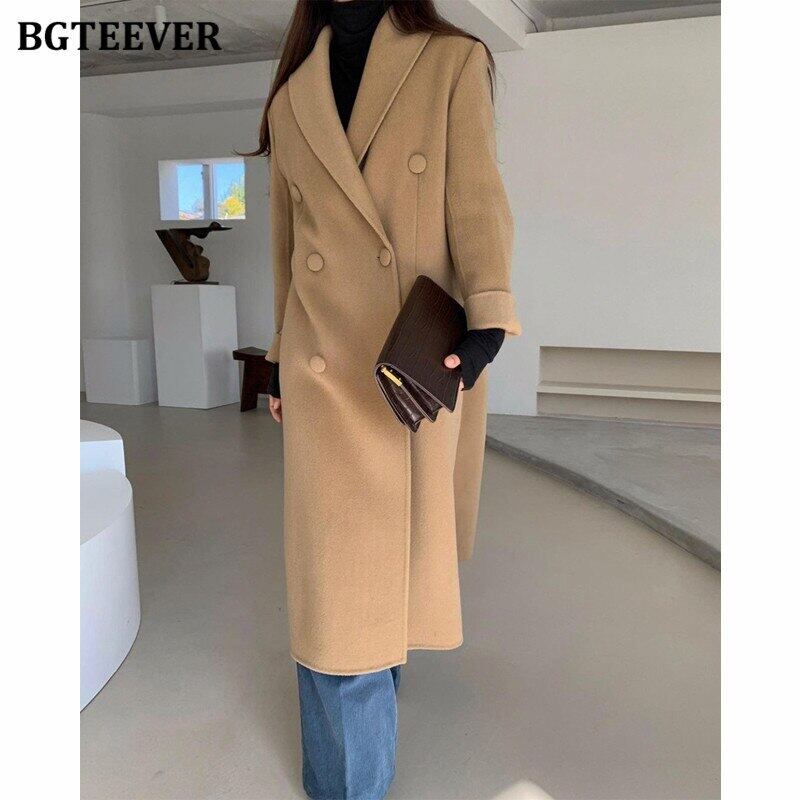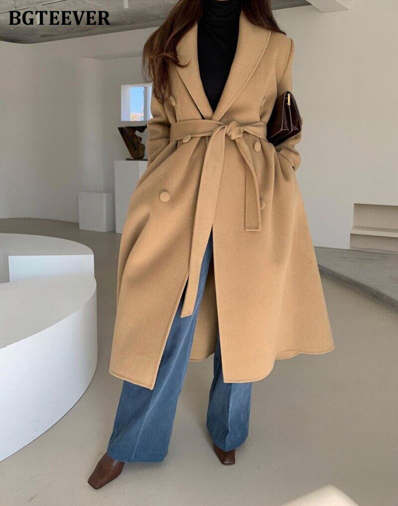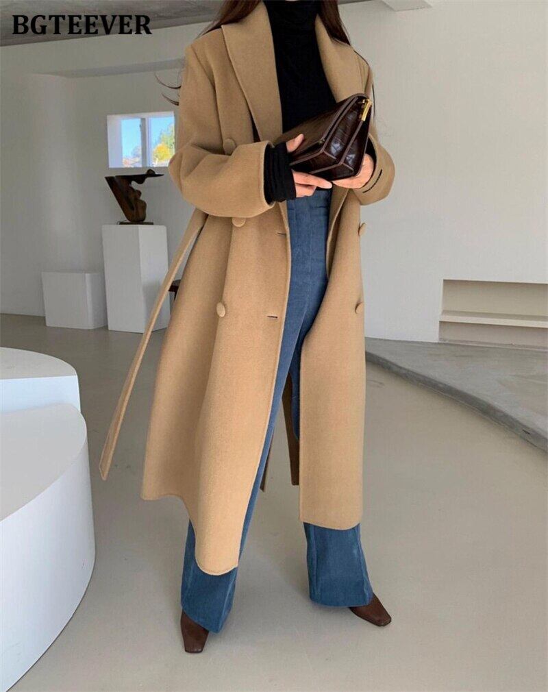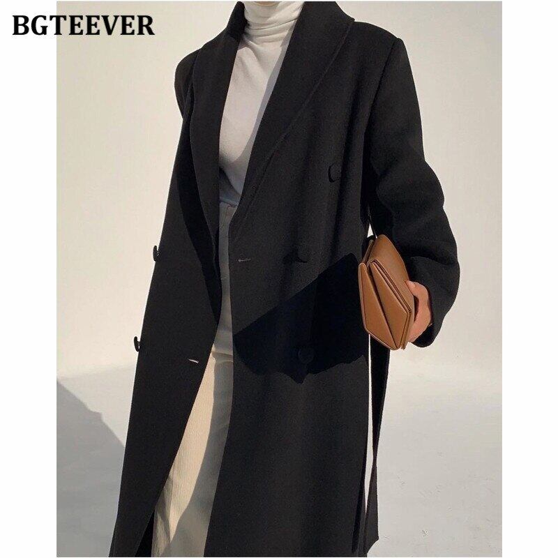 【新作】【送料無料】 BGTEEVERシックなダブルブレストウールコート女性ターンダウンカラーレースアップアウターロングブレンドコート 12b111929989974